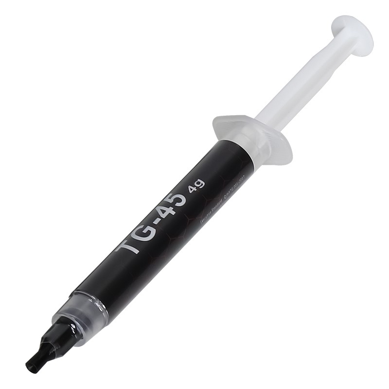 TG-45 è una siringa contenente pasta termica dall'alta conduttività termica, da applicare a CPU e GPU per la miglior dissipazione del calore possibile. Questo è un formato da 4g con spatola.