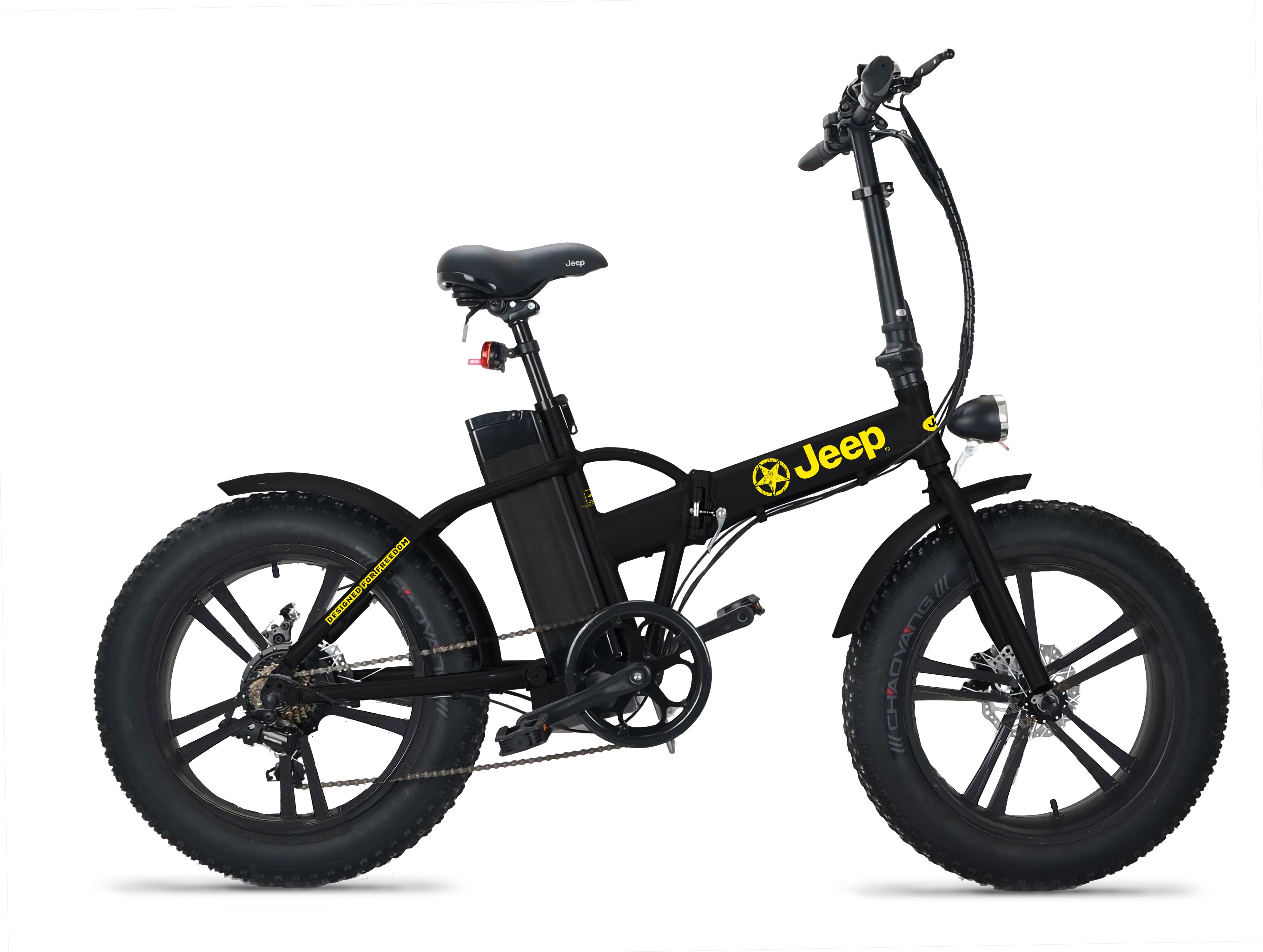 JEEP scende in campo nel mondo della mobilità sostenibile: la nuova linea di E-Bike è sostenibile e dal design unico. La JEEP FOLDING FAT - 6 risponde a tutte le esigenze di mobilità cittadina: leggera, grazie al suo telaio in alluminio, e potente, grazie alla sua batteria da 10 Ah con un motore da 250W. La vecocità massima che può raggiungere è di 25 Km/h. La E-Bike è inoltre dotata di Cambio Shimano da 7 marce e da un Display LCD dove controllare l'autonomia della batteria e la velocità.