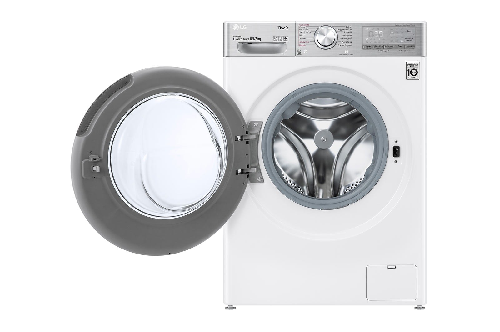 LG F2DV9S8H2E Lavasciuga Slim Intelligente AIDD 8.5/5kg Vapore TurboWash 360 1200 Giri/min Carica frontale Classe E. Tipo di carica: Caricamento frontale, Posizionamento dell'apparecchio: Libera installazione, Colore del prodotto: Bianco. Capacità di asciugatura: 5 kg, Velocità di centrifuga massima: 1200 Giri/min, Classe di efficienza della centrifuga: B. Classe di efficienza energetica (lavaggio): A, Classe di efficienza energetica( lavaggio e asciugatura): E, Consumo di acqua (lavaggio): 49 L. Profondità: 470 mm, Larghezza: 600 mm, Altezza: 850 mm