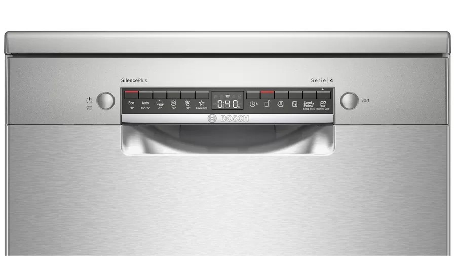 Bosch Serie 4 SMS4ECI14E. Posizionamento dell'apparecchio: Libera installazione, Dimensione: Dimensione massima (60 cm), Colore della porta: Argento. Numero di coperti: 13 coperti, Classe emissione rumore: B, Emissione acustica: 44 dB. Applicazioni per il controllo supportate: Bosch Home Connect. Classe efficienza energetica: C, Consumo di acqua per ciclo: 9,5 L, Consumo energetico per 100 cicli: 74 kWh. Larghezza: 600 mm, Profondità: 600 mm, Altezza: 845 mm