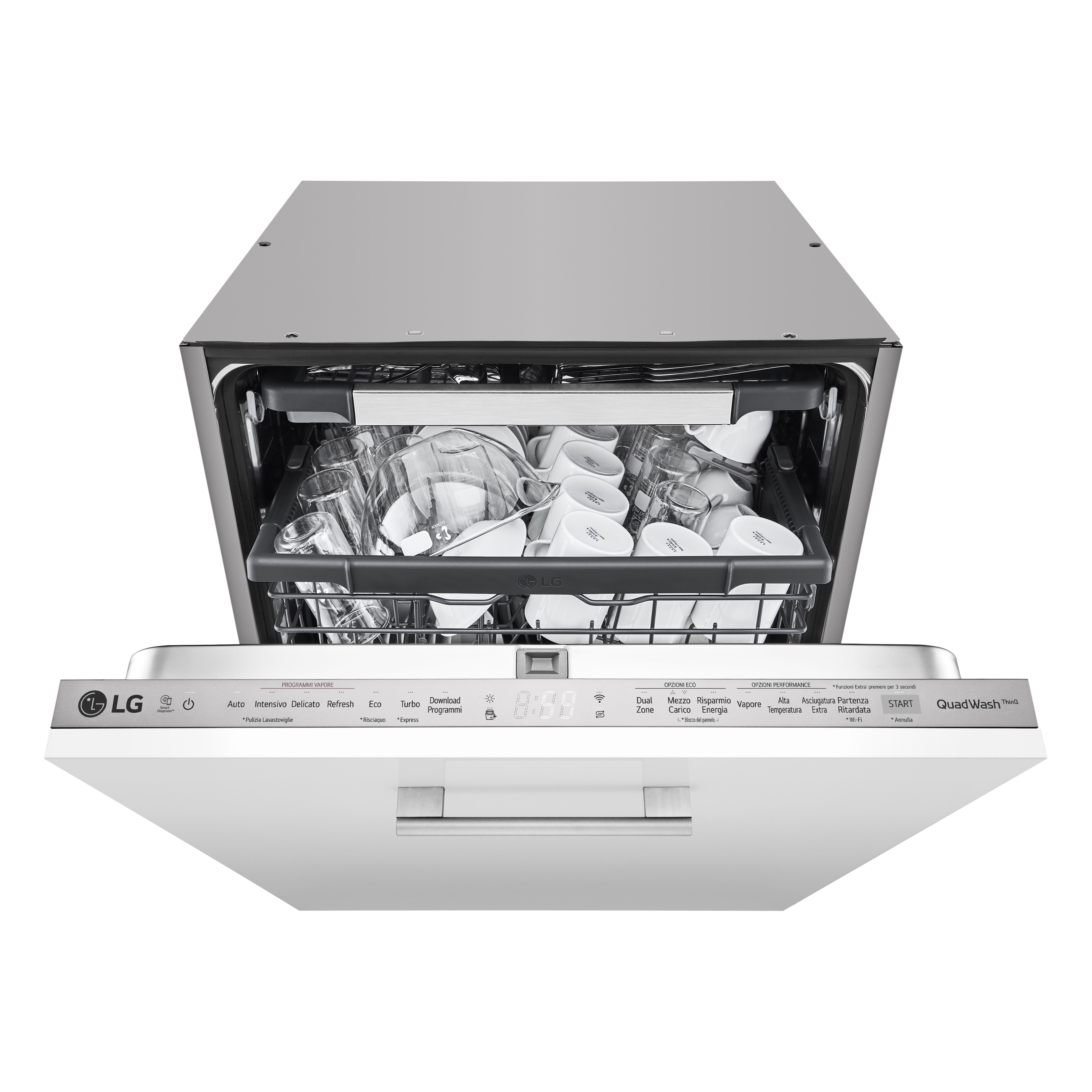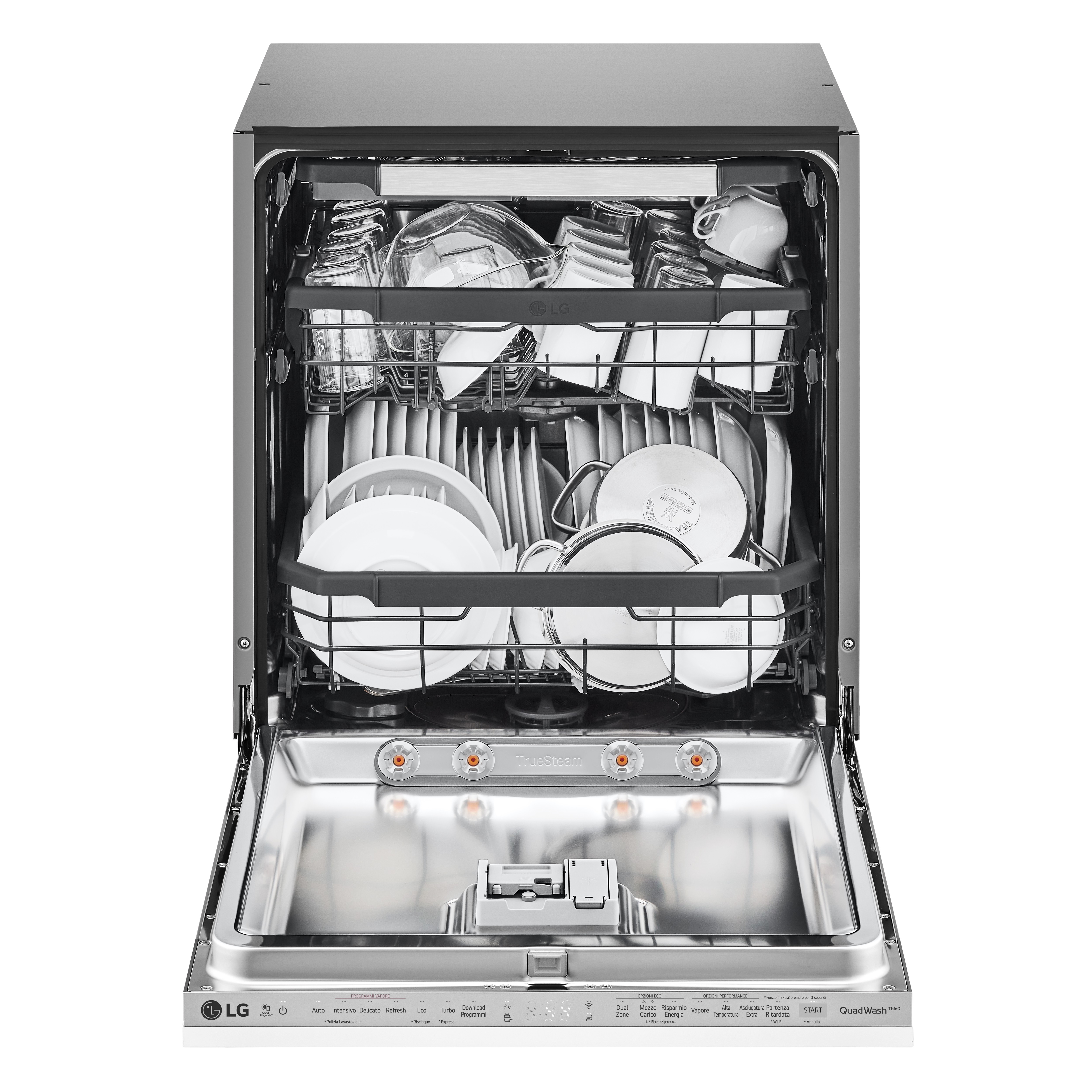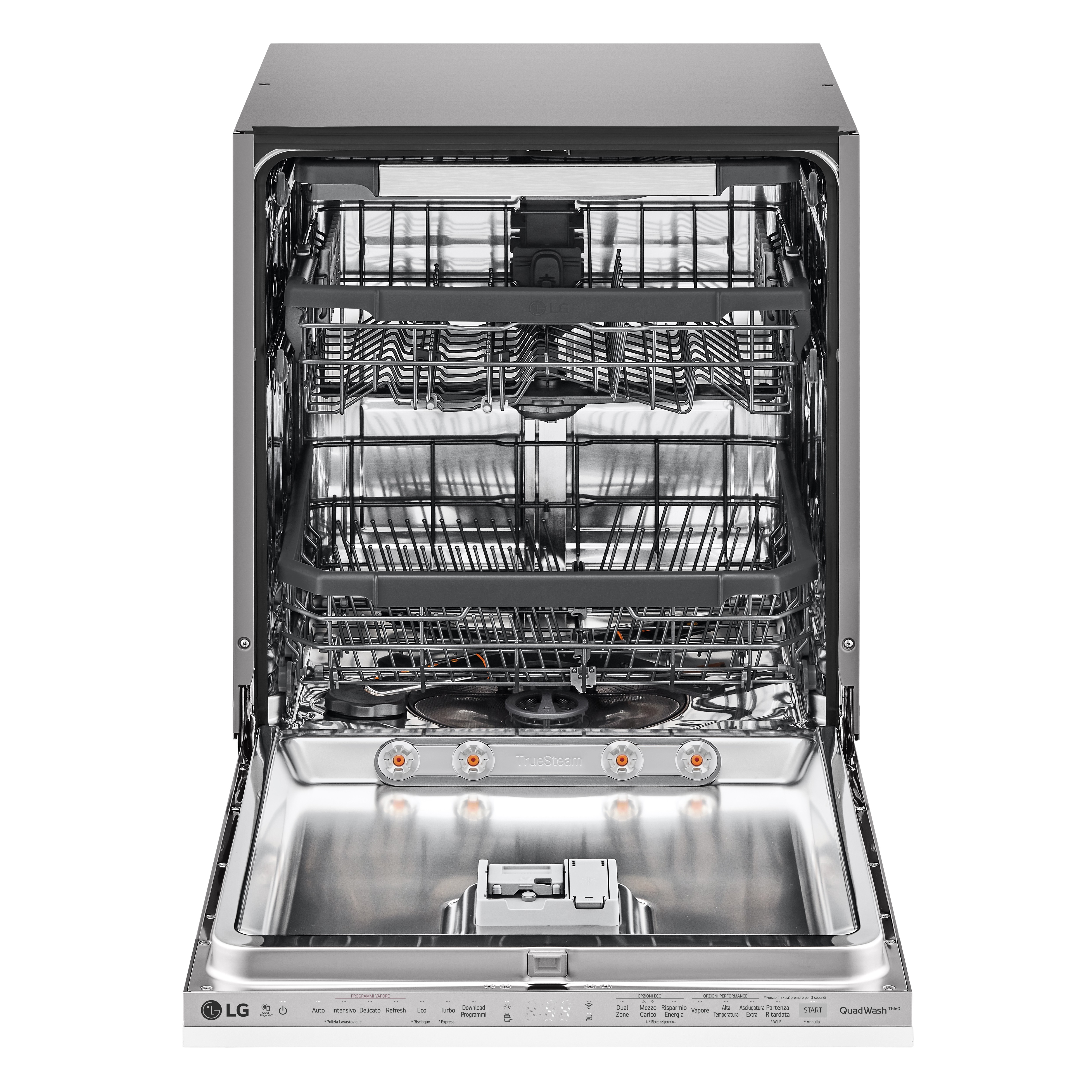 Massima igienizzazione Il Vapore TrueSteam a 100° rimuove fino al 99.999%* dei batteri per una pulizia profonda e massima brillantezza senza alcun alone. Pulizia profonda Le alte temperature del vapore TrueSteam™ sciolgono anche lo sporco più ostinato. Zero aloni Ottieni piatti puliti e scintillanti senza alcun alone. Pulito perfetto in ogni angolo LG QuadWash™ è l’esclusiva tecnologia a 4 bracci irroratori che, grazie alla rotazione multidirezionale, assicura una pulizia completa di tutte le stoviglie da più angolazioni durante l'intero ciclo. Quattro bracci irroratori Il sistema a quattro bracci irroratori, rispetto ai due bracci delle lavastoviglie tradizionali, pulisce anche gli angoli più difficili da raggiungere. Getto multi-direzionale I bracci irroratori sono dotati di un sistema di rotazione multi-direzionale che assicura la massima pulizia. Massima flessibilità di carico Con EasyRack™ puoi personalizzare il cestello per avere massima flessibilità di carico. Caricamento flessibile La rastrelliera personalizzabile offre flessibilità per il caricamento delle stoviglie senza compromettere le performance di pulizia. Altezza facilmente regolabile Con 3 livelli di altezza, è possibile regolare il cestello superiore per poter caricare anche le stoviglie più voluminose. Terzo cestello regolabile Fai spazio anche alle stoviglie più delicate. Massima personalizzazione Le lavastoviglie LG offrono la massima personalizzazione per facilitarti le operazioni in cucina. Ciclo Turbo Effettua un ciclo completo di pulizia in meno di un’ora. Dual Zone Imposta modalità differenti di lavaggio a seconda della quantità di piatti su ciascun cestello. La lavastoviglie intelligente L'app ThinQ ti permette di personalizzare e monitorare la tua lavastoviglie.