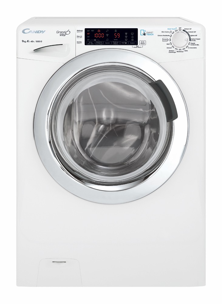 Candy GVS159TWHC701. Tipo di carica: Caricamento frontale. Capacità cestello: 9 kg, Classe di efficienza della centrifuga: A, Classe efficacia di lavaggio: A, Velocità di centrifuga massima: 1500 Giri/min. Classe efficienza energetica: A+++, Consumo energetico annuale: 132 kWh, Consumo annuale di acqua: 11400 L. Colore del prodotto: Bianco