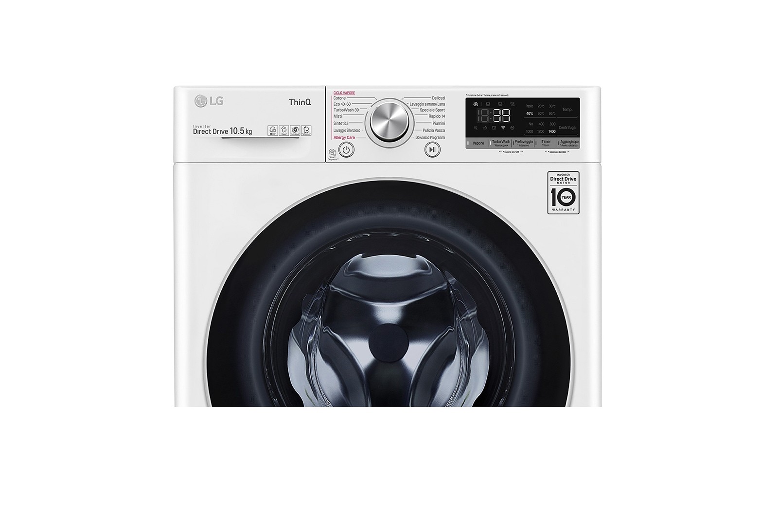 La lavatrice intelligente LG AI DD™ Piu' cura per i tuoi capi: grazie a 20.000 combinazioni di lavaggio possibili, le lavatrici LG AI DD™ non si limitano a rilevare il peso, ma identificano anche la tipologia di tessuti e scelgono autonomamente il lavaggio perfetto. La tecnologia LG AIDD e' presente anche su molte altre lavatrici standard, lavatrici slim o meglio nominate lavatrici strette, e lavasciuga di tutte le dimensioni. Vapore Steam™ Grazie al vapore Steam™, la lavatrice elimina il 99,9% degli allergeni responsabili di allergie e problemi respiratori igienizzando i tuoi capi. TurboWash 360™ : pulito eccellente in 39 minuti Con TurboWash 360™ il tuo bucato può essere pulito e igienizzato perfettamente in soli 39 minuti. Grazie alla tecnologia 3D Multi Spray a getti multi-direzionali, la lavatrice raggiunge ogni centimetro del tuo bucato garantendo un pulito profondo e maggiore cura dei tuoi capi. Più spazio per i tuoi capi La lavatrice presenta le stesse dimensioni, ma un cestello più grande. Con un carico di lavaggio di 10.5 kg in soli 55 cm di profondità, la lavatrice e' adatta a tutti gli spazi. Design Premium Le lavatrici LG hanno un ampio oblò in vetro temperato resistente ed elegante, e agitatori in acciaio inox igienici e duraturi. Inoltre le lavabiancheria presentano un display visibile e una manopola più grande con finitura in metallo. Connettivita' Smart Con la tecnologia SmartThinQ™, la tua lavatrice è ancora più intelligente: dalla gestione a distanza del bucato alla possibilità di scaricare nuovi cicli di lavaggio. Interagisci con la lavatrice, l'asciugatrice e con gli altri elettrodomestici LG sfruttando le ultime innovazioni con la connettività Wi-Fi. Il supporto per i dispositivi smart home compatibili con Google Assistant può variare in base al Paese e alla configurazione della propria smart home. Libera Installazione Le lavatrici a libera installazione sono elettrodomestici che possono essere posizionati ovunque in casa garantendo un'ampia libertà di movimento. Colore Bianco La lavatrice è disponibile nel colore bianco.