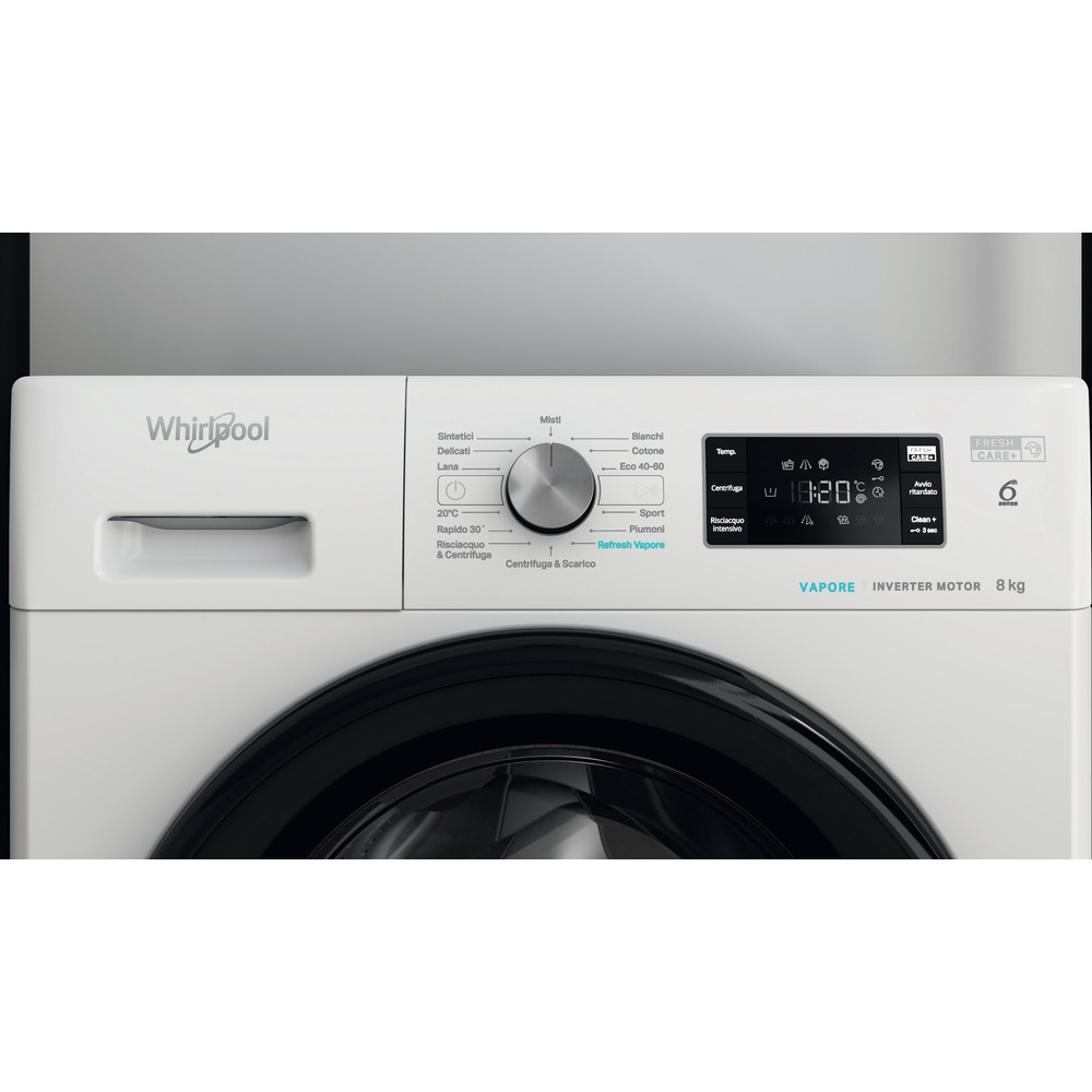 Caratteristiche di questa lavatrice a libera installazione Whirlpool: colore bianco. Cestello spazioso da 8 kg. Centrifuga a 1200 giri al minuto ad alta efficienza. Esclusiva tecnologia 6° SENSO che adatta dinamicamente le impostazioni in base alle caratteristiche di ciascun carico, garantendo una cura ideale per tutti i tessuti. Tecnologia 6° SENSO La tecnologia 6° SENSO tratta i tessuti con estrema delicatezza, senza compromettere le performance di pulizia, lasciando i capi come nuovi e i colori brillanti. I sensori intelligenti all'interno del cestello analizzano il carico e impostano il consumo di energia, permettendoti di risparmiare acqua, energia e tempo. FreshCare+ La nuova tecnologia FreshCare+ mantiene i tuoi capi freschi fino a 6 ore dopo la fine del ciclo di lavaggio. Quando non hai tempo di scaricare la lavatrice o hai intenzione di rimanere fuori casa, questa tecnologia mantiene il bucato soffice e fresco all'interno della lavatrice e inibisce la proliferazione delle principali fonti di cattivi odori. Tutto questo grazie a lente oscillazioni del cestello alternate a getti di vapore. Steam Refresh Il ciclo ideale per rinfescare i tuoi vestiti in soli 20 minuti senza lavarli. Il vapore rimuove i cattivi odori e rilassa i tessuti, rendendo più facile la stiratura. Motore SenseInverter Il motore estremamente silenzioso ed evoluto garantisce alla lavasciuga risparmio energetico e performance di lunga durata. Garantito 10 anni 1200 giri al minuto Straordinaria velocità di centrifuga. Lavatrice Whirlpool con velocità di centrifuga di 1200 giri al minuto. Capacità 8 Kg Tutto lo spazio di cui hai bisogno. Con la sua capacità di carico di 8 Kg, questa lavatrice Whirlpool offre tutto lo spazio di cui hai bisogno per il tuo bucato. Livello di sporco Risultati su misura. Questa lavatrice Whirlpool rileva il livello di sporco del tuo bucato e imposta automaticamente i parametri di lavaggio per risultati sempre perfetti. Blocco di sicurezza bambini La sicurezza prima di tutto. Questa Lavasciuga Whirlpool è dotata di un sistema di sicurezza che previene l'uso accidentale dell'elettrodomestico da parte dei bambini. Giornaliero Il lavaggio di ogni giorno Il programma giornaliero completa un ciclo di lavaggio a carico misto cotone e sintetico (3.5 kg) in soli 60 minuti, a 40°C. Indicatore di avanzamento programma Comandi intuitivi. L'indicatore di avanzamento programma ti permette di seguire il progresso dei cicli di lavaggio in maniera semplice e intuitiva. Lavaggio rapido Risultati rapidi. Con la funzione di lavaggio rapido otterrai risultati perfetti in soli 30 minuti. Indicazione tempo residuo Organizzazione perfetta. L'indicatore tempo residuo ti informa in maniera semplice ed intuitiva in merito al tempo rimasto fino alla conclusione del programma. Programma lana La miglior cura per i tuoi capi in lana. I nostri programmi per capi in lana offrono tutta la protezione e tutto il comfort di cui hai bisogno. Programma Rapido Per la tua comodità. Con la funzione di lavaggio rapido otterrai risultati perfetti in soli 30 minuti. Partenza ritardata Questa opzione ti permette di far inziare il ciclo di lavaggio quando è più conveniente per, risparmaindo tempo ed energia.