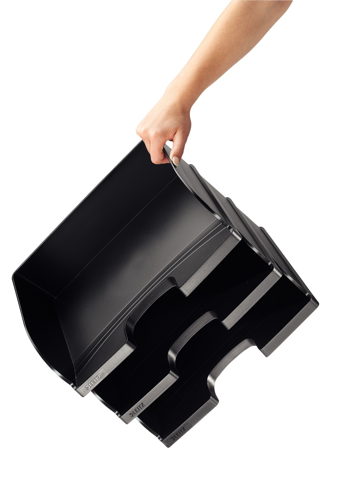 Vaschetta portacorrispondenza dalla capacità superiore in formato orizzontale. Estremamente stabile e robusta. Design e colori in coordinato con la linea di prodotti in plastica iniettata Leitz PLUS.