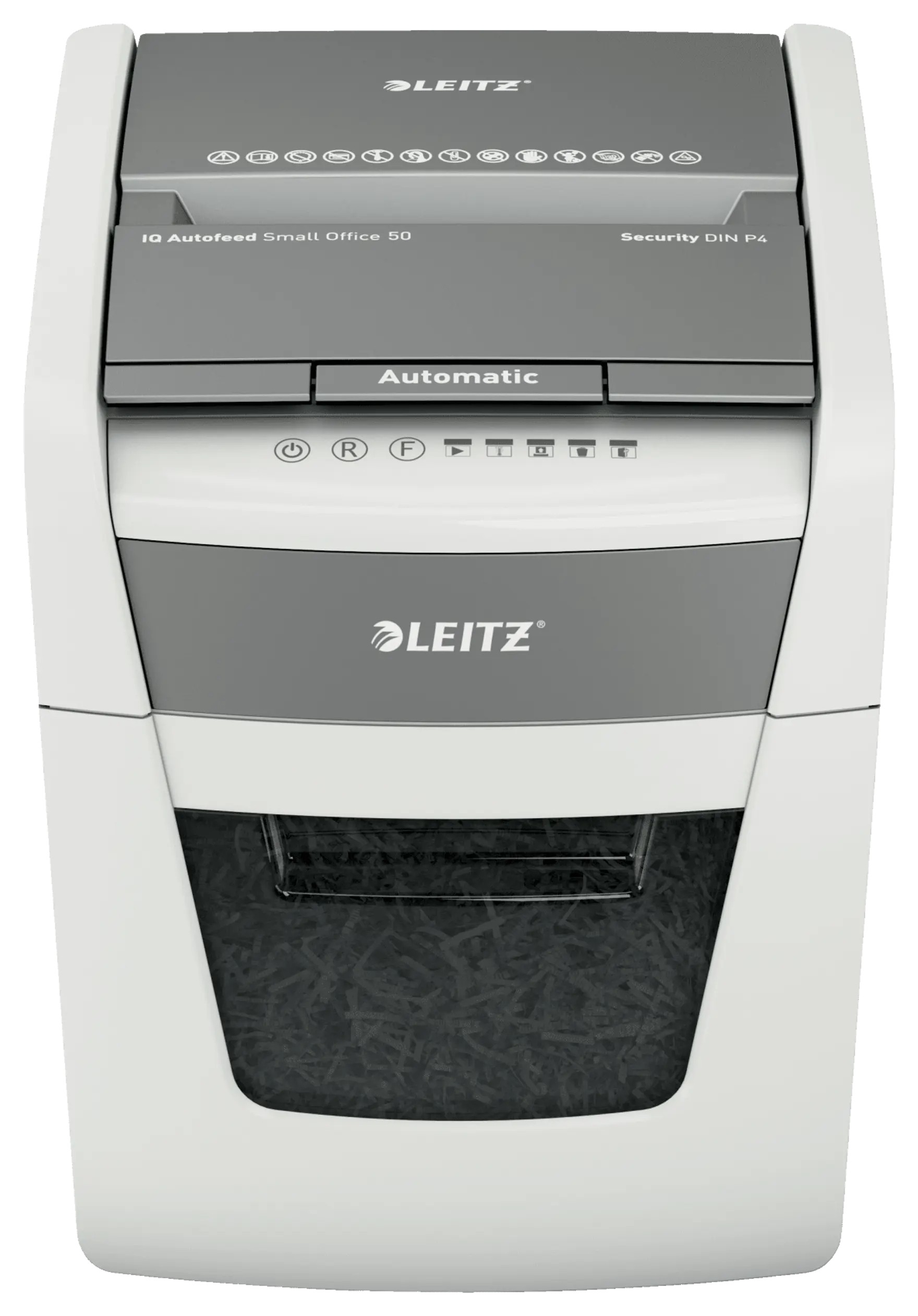 Il distruggidocumenti Leitz IQ è completamente automatico. Così intelligente che lavora da solo senza fare rumore, basta inserire la risma di carta (incl. punti e graffette), chiudere il coperchio e si potrà andare avanti con la propria giornata. Ideale per l'uso in piccoli uffici o a casa. Riservatezza e prestazioni eccellenti sono garantite con questo distruggidocumenti ad alimentazione automatica con tecnologia anti inceppamento, silenzioso e con ciclo di lavoro di 10 minuti. Distrugge automaticamente fino a 50 fogli A4 in frammenti con un livello di sicurezza P4 (4x28 mm) rilasciati nel compatto cestino da 20 litri. Funzionamento semplice grazie ai comandi touch.