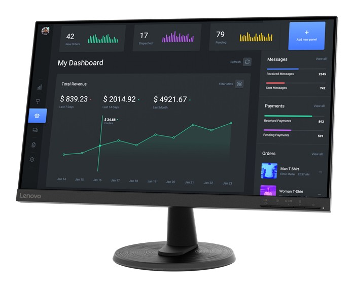Lenovo D24-40. Dimensioni diagonale schermo: 60,5 cm (23.8"), Risoluzione del display: 1920 x 1080 Pixel, Tipologia HD: Full HD, Tecnologia display: LED, Tempo di risposta: 19 ms, Rapporto d'aspetto nativo: 16:9, Angolo di visualizzazione (orizzontale): 178°, Angolo di visualizzazione (verticale): 178°. Montaggio standard VESA. Colore del prodotto: Nero
