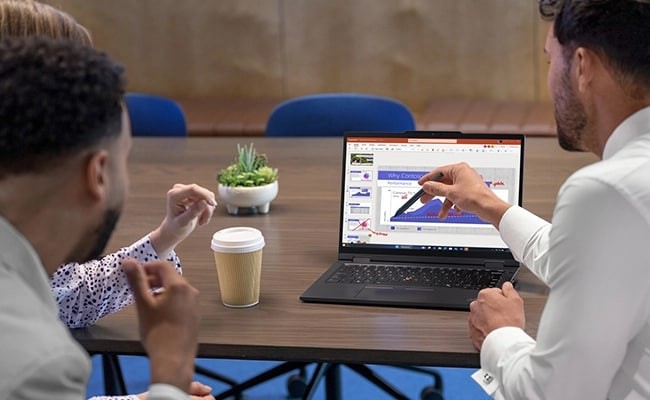 Che tu stia condividendo o creando contenuti, il laptop ThinkPad T14s 2-in-1 da 35,56 cm (14") offre eccellenti opzioni di display. Sempre touchscreen, ovviamente, ma offre anche opzioni per dare priorità al risparmio energetico o alla privacy, oltre alla fedeltà cromatica e alla sicurezza degli occhi.