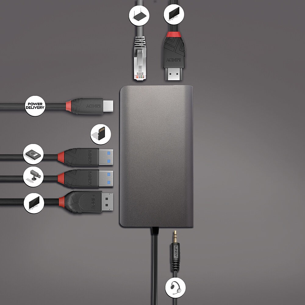 Il Mini dock per laptop USB 3.2 Tipo C di Lindy è la soluzione compatta e versatile per collegare i laptop, tablet o telefoni cellulari a una serie di interfacce, compresi i display. Dotato di tutte le interfacce essenziali per una moderna postazione di lavoro, questo Mini Dock utilizza un singolo cavo USB 3.2 Type C per collegare fino a due display, migliorando al contempo la connettività ad altri dispositivi attraverso Gigabit Ethernet, USB 3.2 / 3.1 Gen 1 / USB 3.0 SuperSpeed e porte per schede SD. Dispone anche di una porta audio per il collegamento di una cuffia o di un microfono. Il Mini dock permette la connessione di un display a un laptop via HDMI o Displayport a risoluzioni di 3840x2160@30Hz o di entrambi simultaneamente usando la modalità DisplayPort Alternate attraverso la porta USB Type C. È dotato di una porta USB Tipo C combinata per dati e alimentazione che supporta Power Delivery fino a 100W mentre trasmette dati fino a 5Gbps. Il Power delivery 3.0 supporta la trasmissione di corrente fino a quasi 100 Watt e permette di raggiungere valori di tensione e corrente più elevati tra i dispositivi collegati - host o periferiche. Le due porte USB di tipo A integrate forniscono fino a 5Gbps di trasferimento dati, perfette per collegare periferiche di tipo A come un disco rigido, una stampante o una webcam. La porta USB destra supporta anche la USB Battery Charging Specification 1.2 per la ricarica dei dispositivi mobili, che è in grado di fornire 5V e fino a 1.5A per una ricarica più veloce rispetto a una porta USB standard. Informazioni sullo standard USB 3.0, USB 3.1 & USB 3.2 PC, dispositivi e cavi USB 3.0, USB 3.1 e USB 3.2 sono tutti compatibili fra di loro utilizzando sia interfacce USB di Tipo A che di Tipo C. USB 3.0, USB 3.1 Gen 1 e USB 3.2 Gen 1 supportano tutti velocità di trasferimento fino a 5 Gbps. USB 3.1 Gen 2 e USB 3.2 Gen 2 supportano entrambi velocità di trasferimento fino a 10 Gbps.