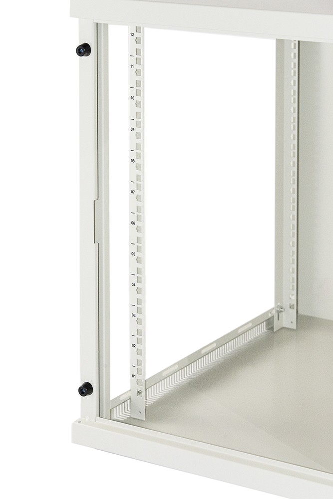 - Con 4 montanti laterali verticali da 19" già installati. Questi montanti sono regolabili come posizione, quindi si possono allontanare o avvicinare a seconda delle esigenze, con la massima flessibilità.