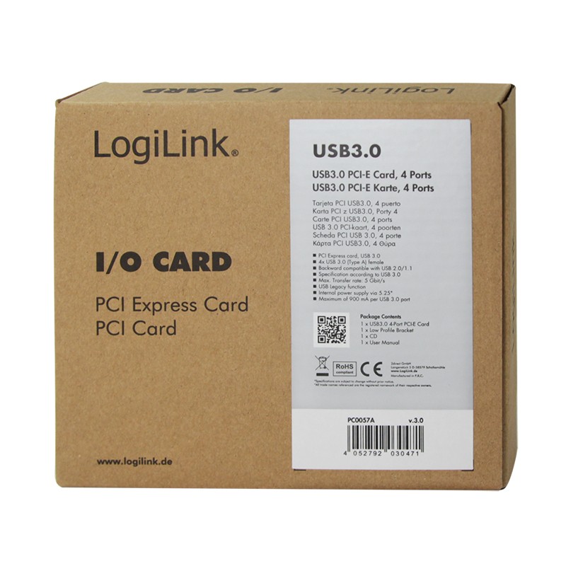 LogiLink PC0057A, PCIe, USB 3.2 Gen 1 (3.1 Gen 1), PC, VIA VL805, 5 Gbit/s, Windows 7 Home Basic, Windows 8, Windows 8.1, Windows Vista Home Basic, Windows XP Home