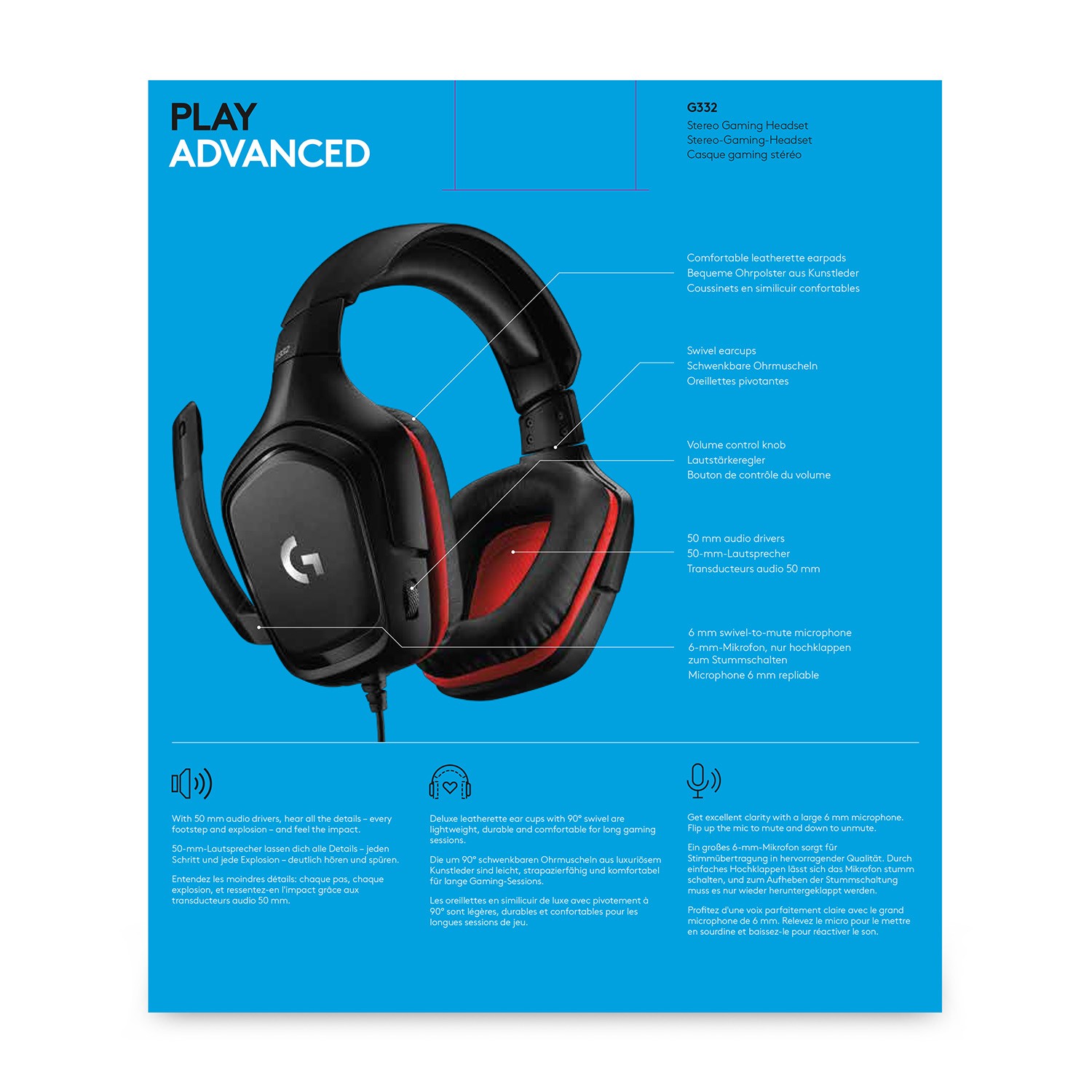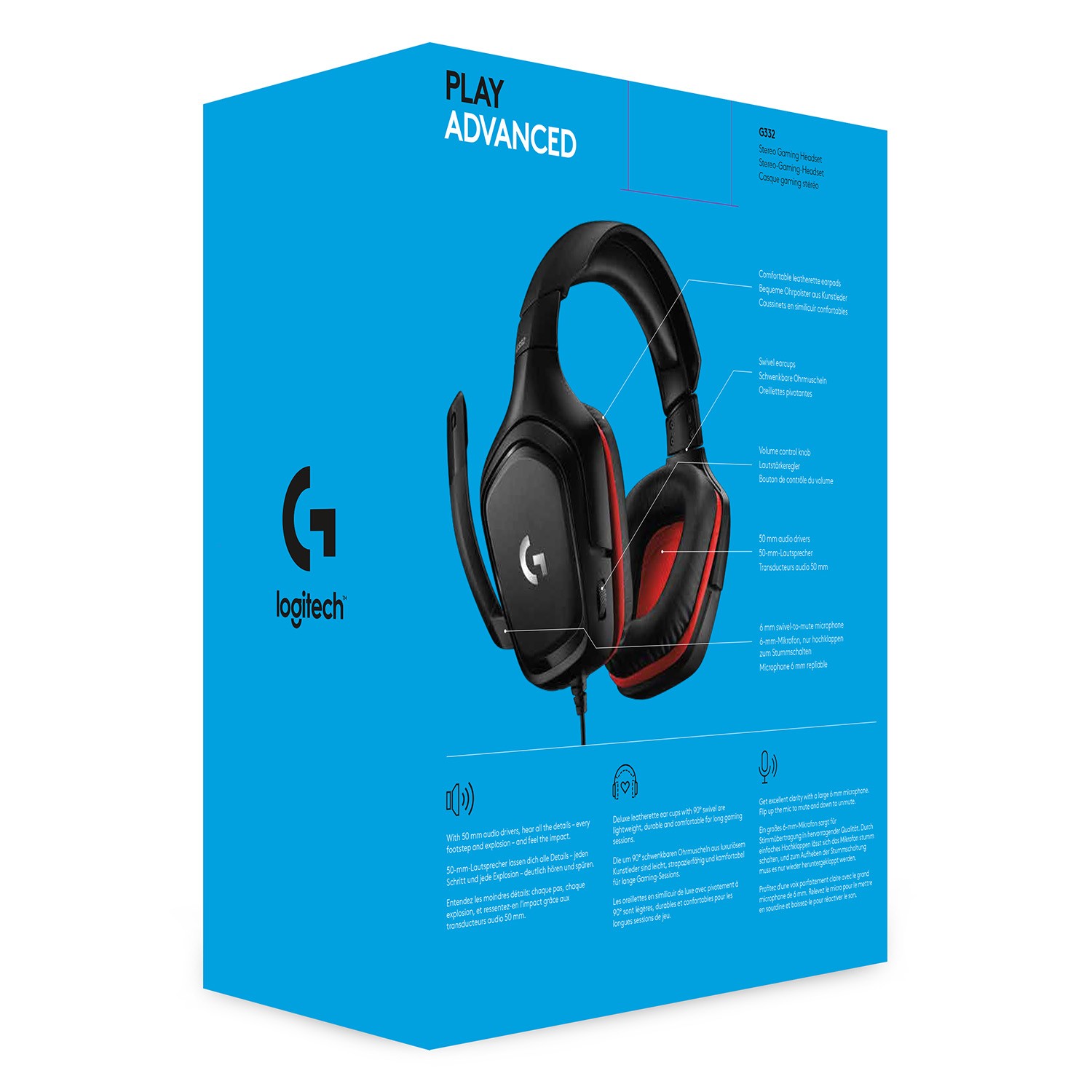 Logitech G G332. Tipo di prodotto: Auricolare. Tecnologia di connessione: Cablato. Utilizzo raccomandato: Giocare. Frequenza cuffia: 20 - 20000 Hz. Lunghezza cavo: 2 m. Peso: 280 g. Colore del prodotto: Nero, Rosso