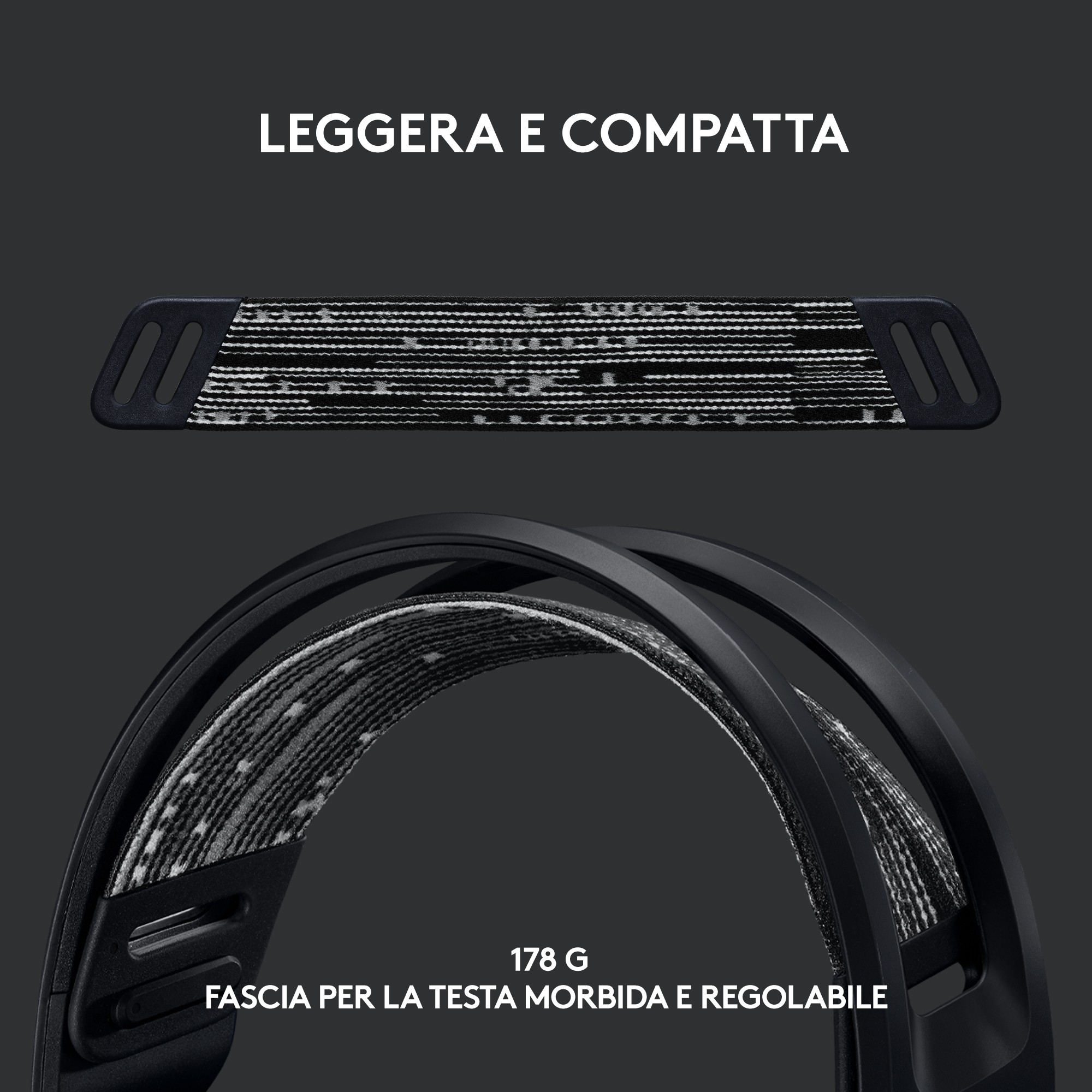 | Contenuto della confezione | Cuffia con microfono gaming wireless RGB G733 LIGHTSPEED Microfono rimovibile Ricevitore USB wireless Cavo di ricarica da USB-C a USB-A |