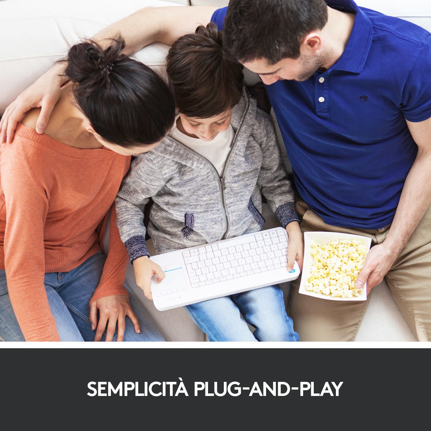 Logitech K400 Plus Tastiera Wireless Touch TV, Facili Controlli Multimediali e Touchpad Integrato, Tastiera HTPC per TV Collegata al PC, Windows, Android, Chrome OS, Laptop, Tablet, Mini, Wireless, RF Wireless, Interruttore a chiave a membrana, QWERTY, Bianco