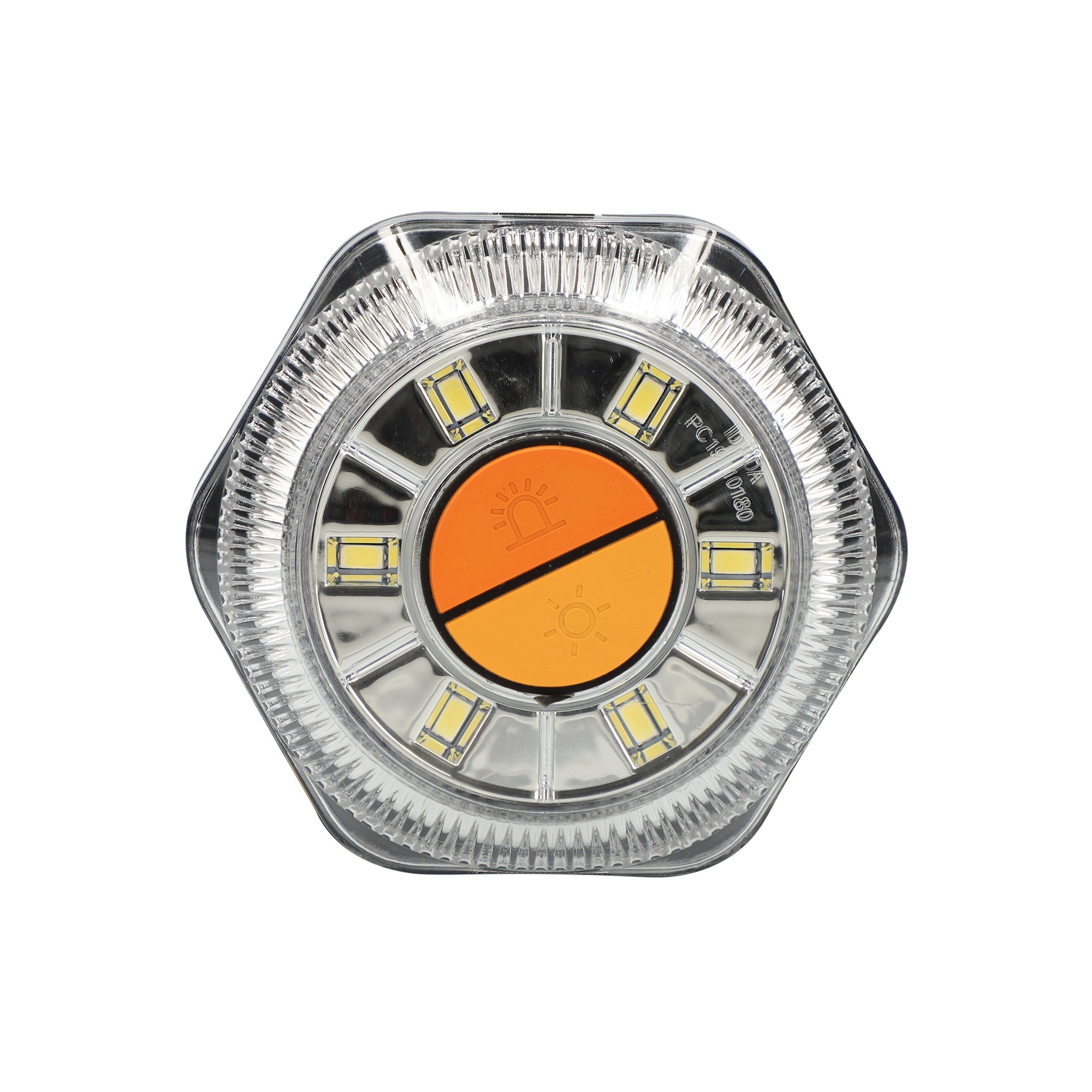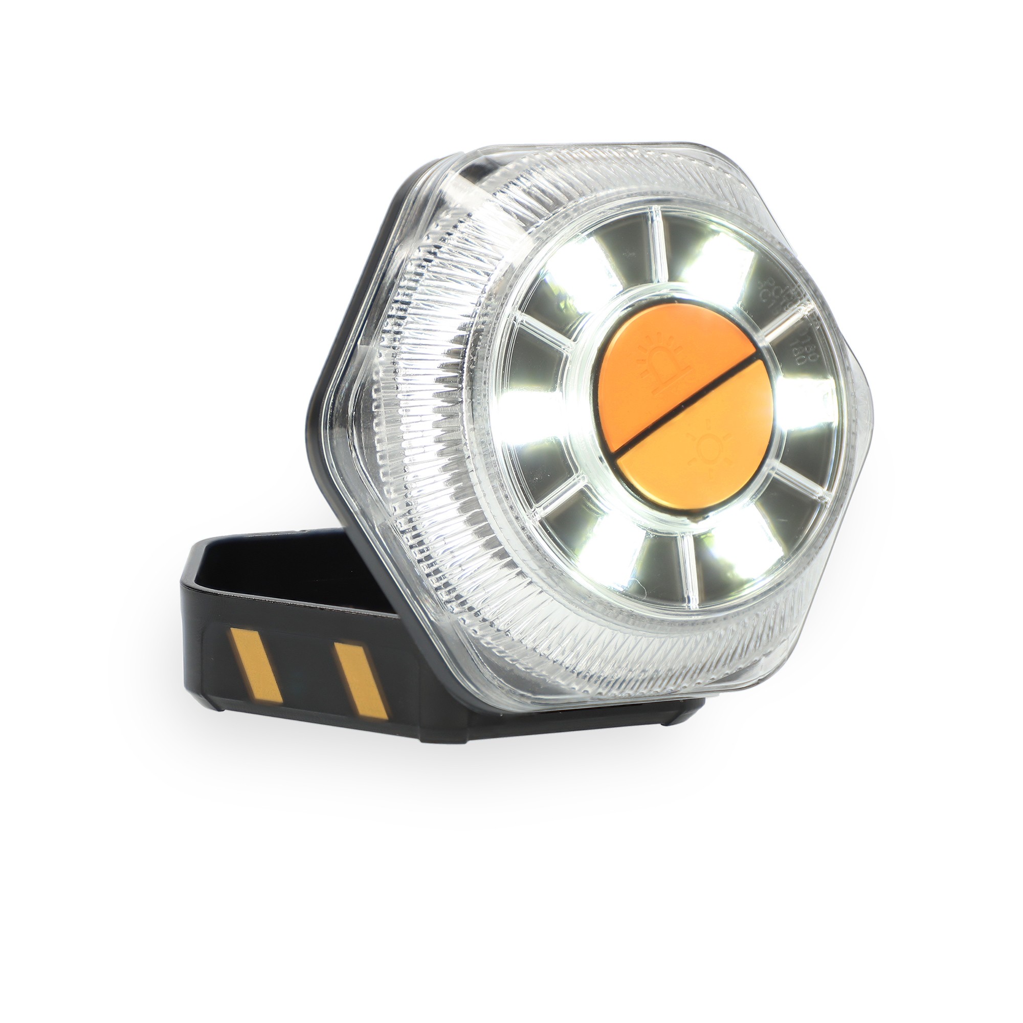 -Attivabile premendo il pulsante corrispondente (modalità luce di emergenza o modalità torcia a luce bianca) Emette un intenso triplo flash in giallo automatico che copre 360°. Di notte è visibile in tutte le direzioni per più di un chilometro