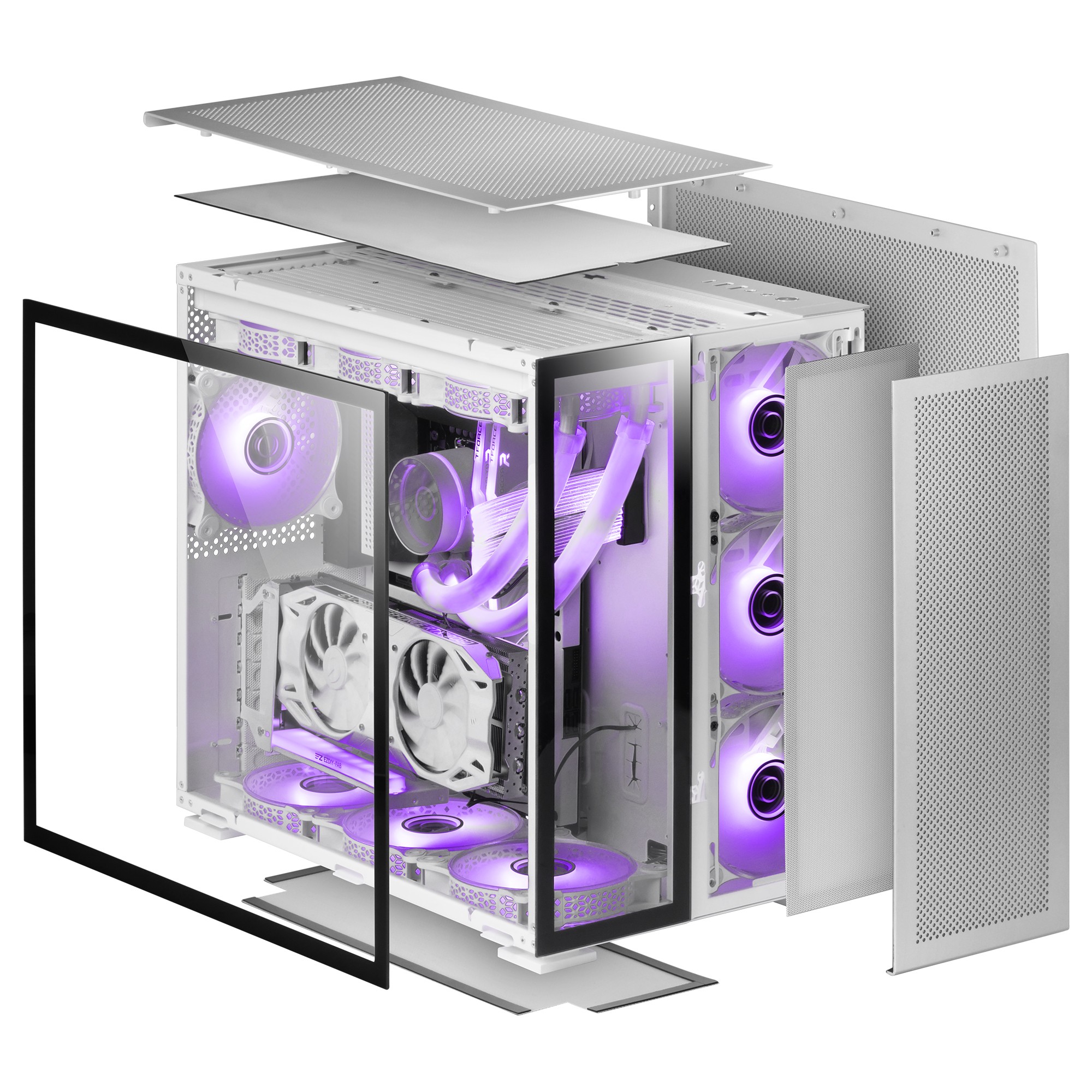 Il nostro case da gioco di alta qualità, realizzato in alluminio aerospaziale spesso 2 mm, doppio vetro temperato, raffreddamento della scheda madre su entrambi i lati, grandi pannelli di ventilazione rimovibili, filtri antipolvere nascosti, supporto per un massimo di 12 ventole, supporto completo per il raffreddamento a liquido, struttura a doppia camera e dimensioni E-ATX XXL per creare i sistemi da gioco più estremi che si possano immaginare.