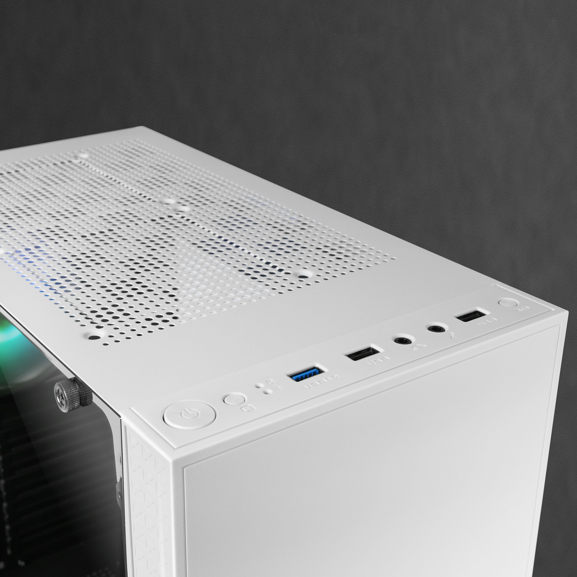 Telaio ATX XL con supporto anteriore e superiore per dissipatori a liquido da 240 mm, un sistema completo di illuminazione ARGB anteriore tripla e ventola posteriore sincronizzata, nonché una finestra laterale in vetro temperato per mostrare il tutto.