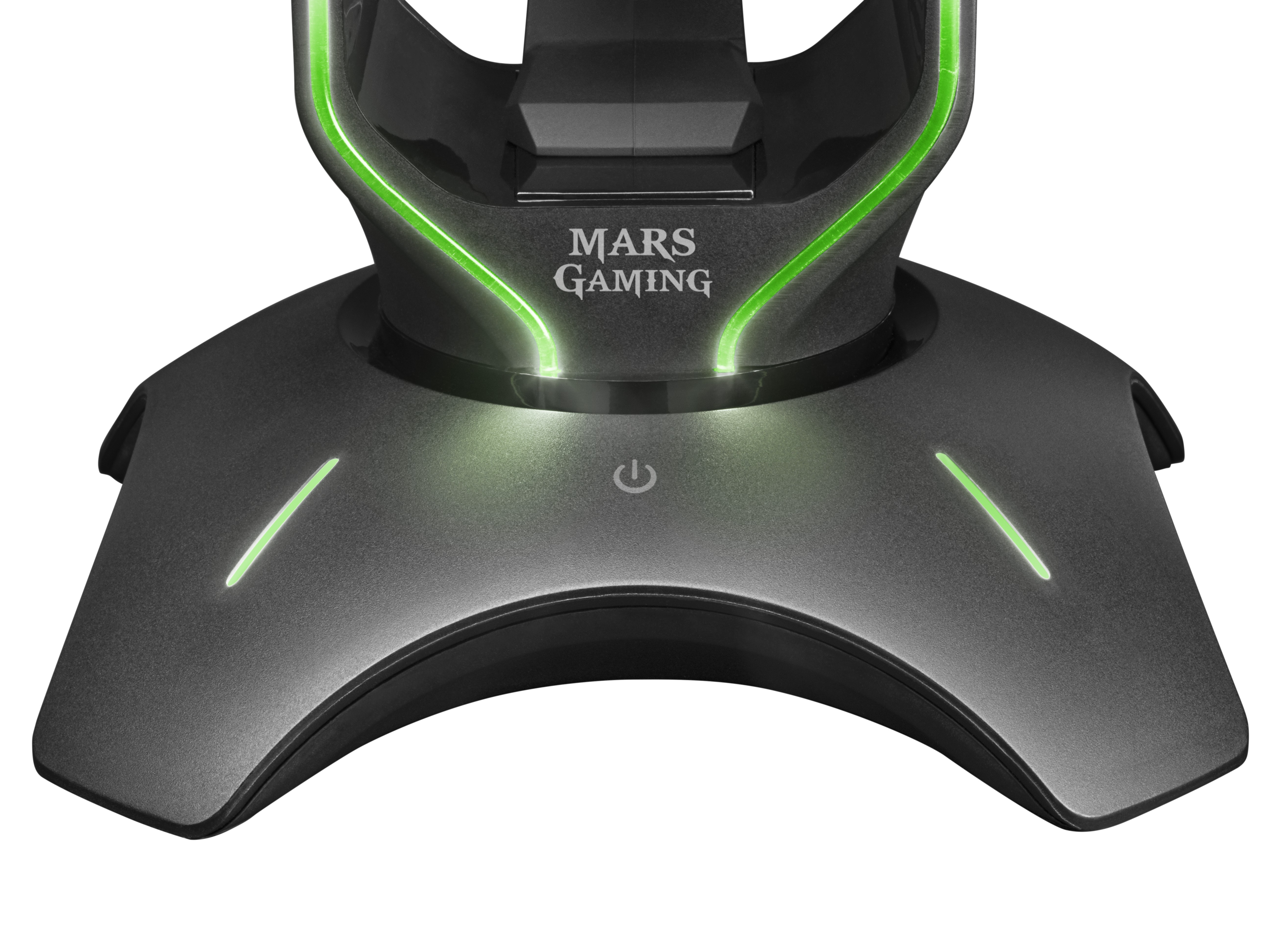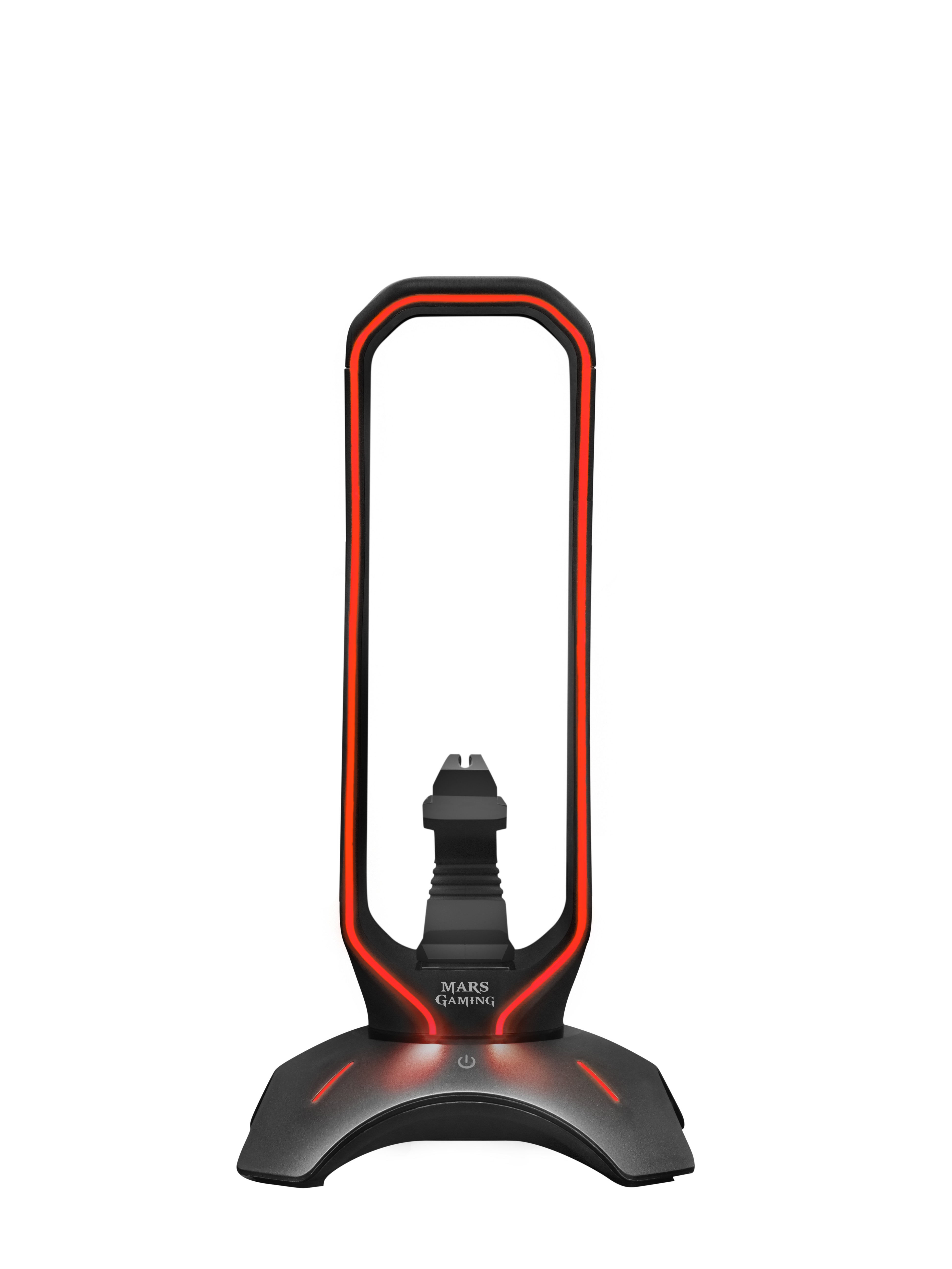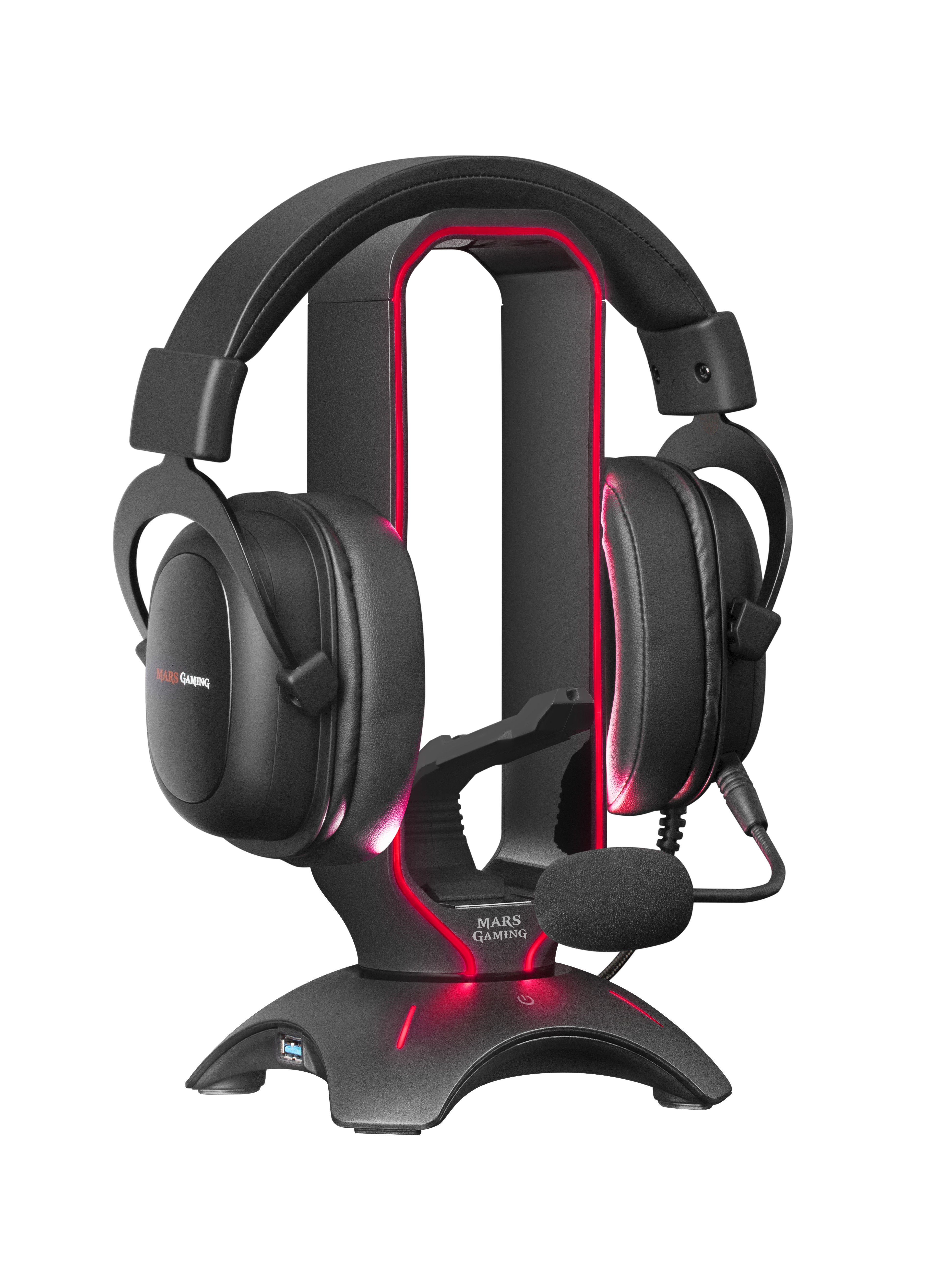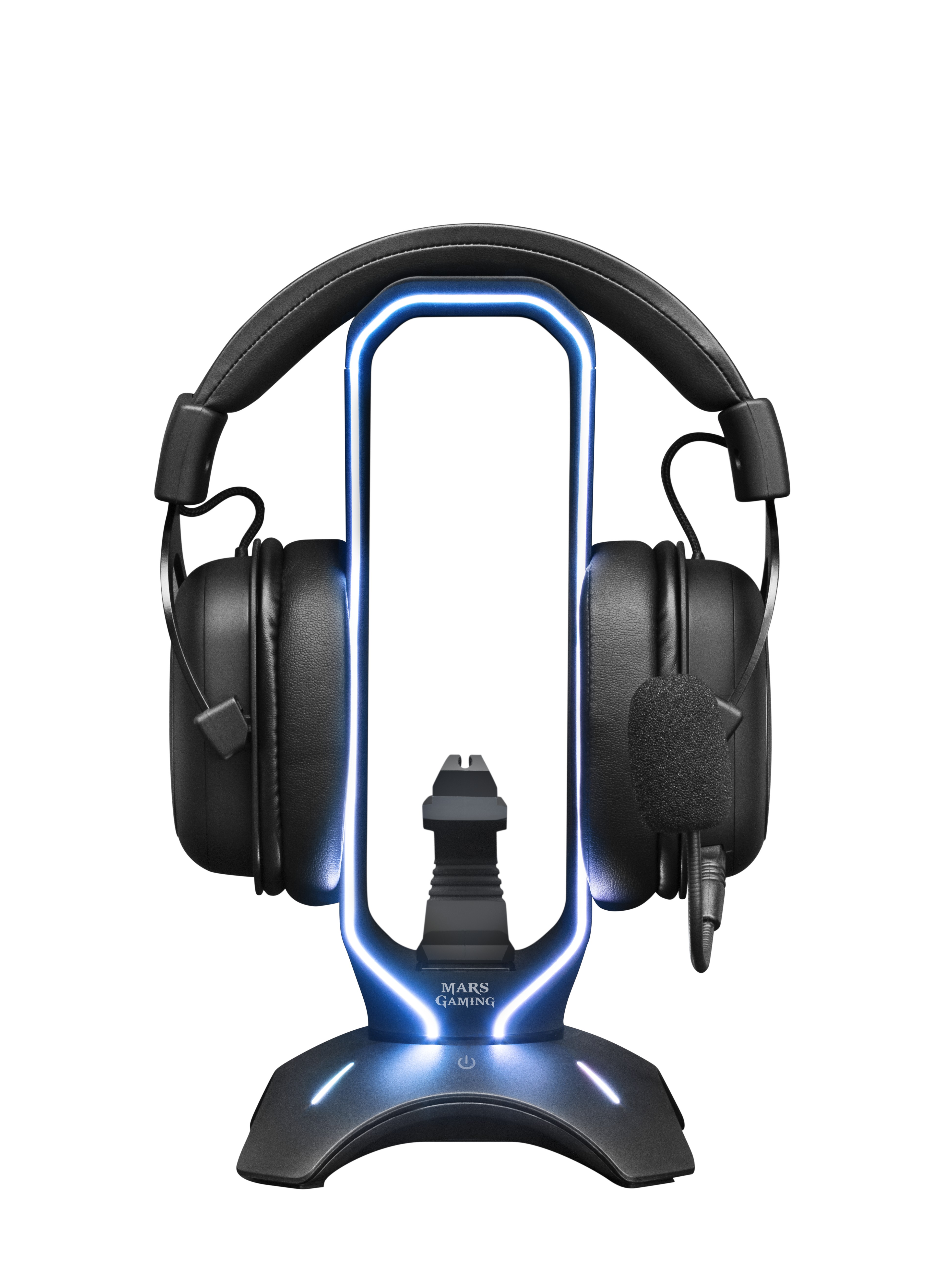 Mars Gaming MHHPRO. Tipo di prodotto: Headphone holder, Colore del prodotto: Nero, colore d'illuminazione: Rosso/Verde/Blu. Larghezza: 125 mm, Profondità: 125 mm, Altezza: 254 mm. Connettore USB: USB tipo A, Tensione di uscita USB: 5 V, Corrente di uscita USB: 0,9 A. Quantità per cartone principale: 12 pezzo(i)