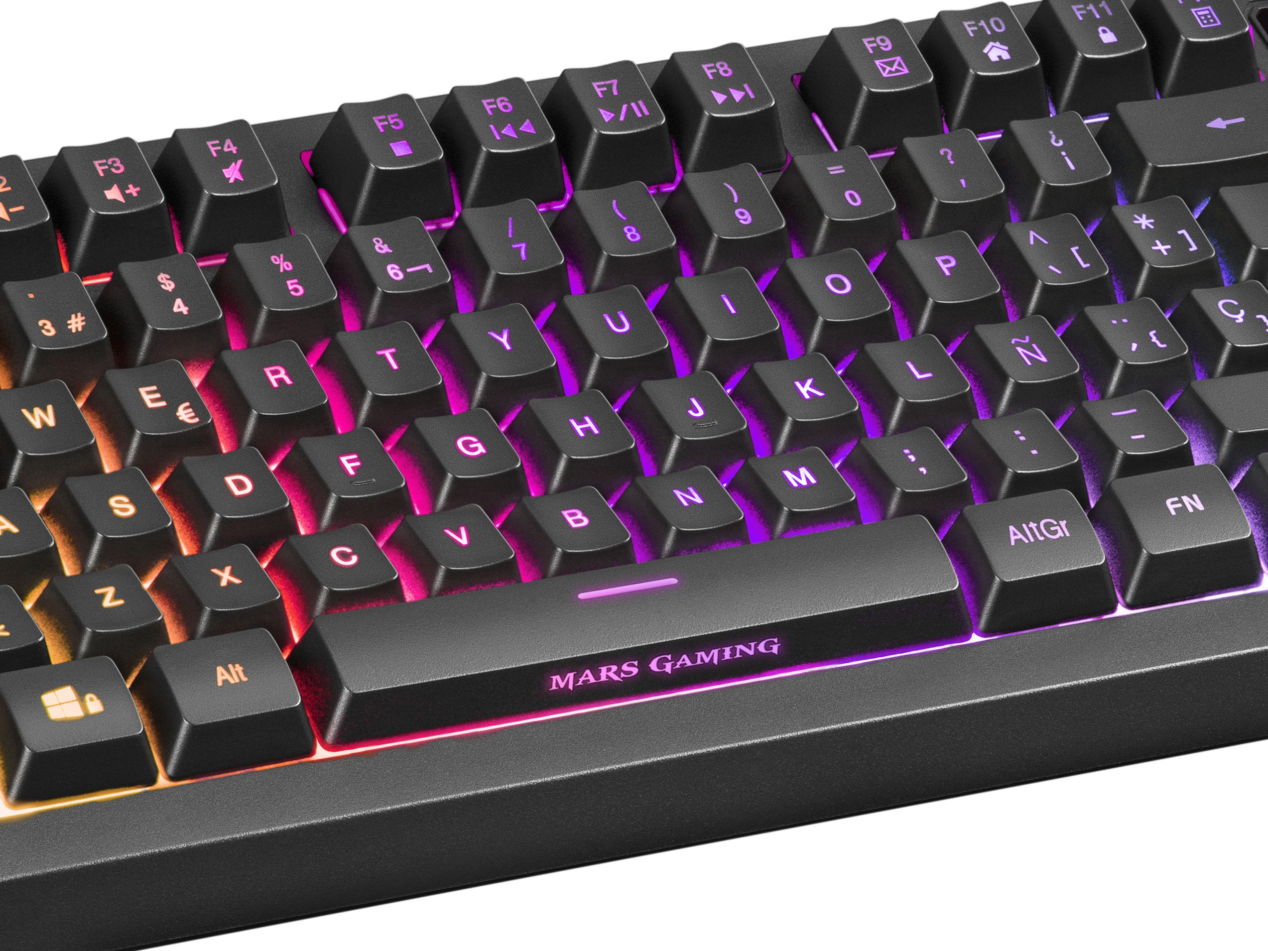 Mars Gaming MKREVOPT. Fattore di forma tastiera: Full-size (100%). Stile tastiera: Dritto. Tecnologia di connessione: Cablato, Interfaccia dispositivo: USB, Interruttore a chiave per tastiera: Interruttore a chiave a membrana. Tipologia di retroilluminazione: LED RGB. Lunghezza cavo: 1,7 m. Utilizzo raccomandato: Giocare. Colore del prodotto: Nero