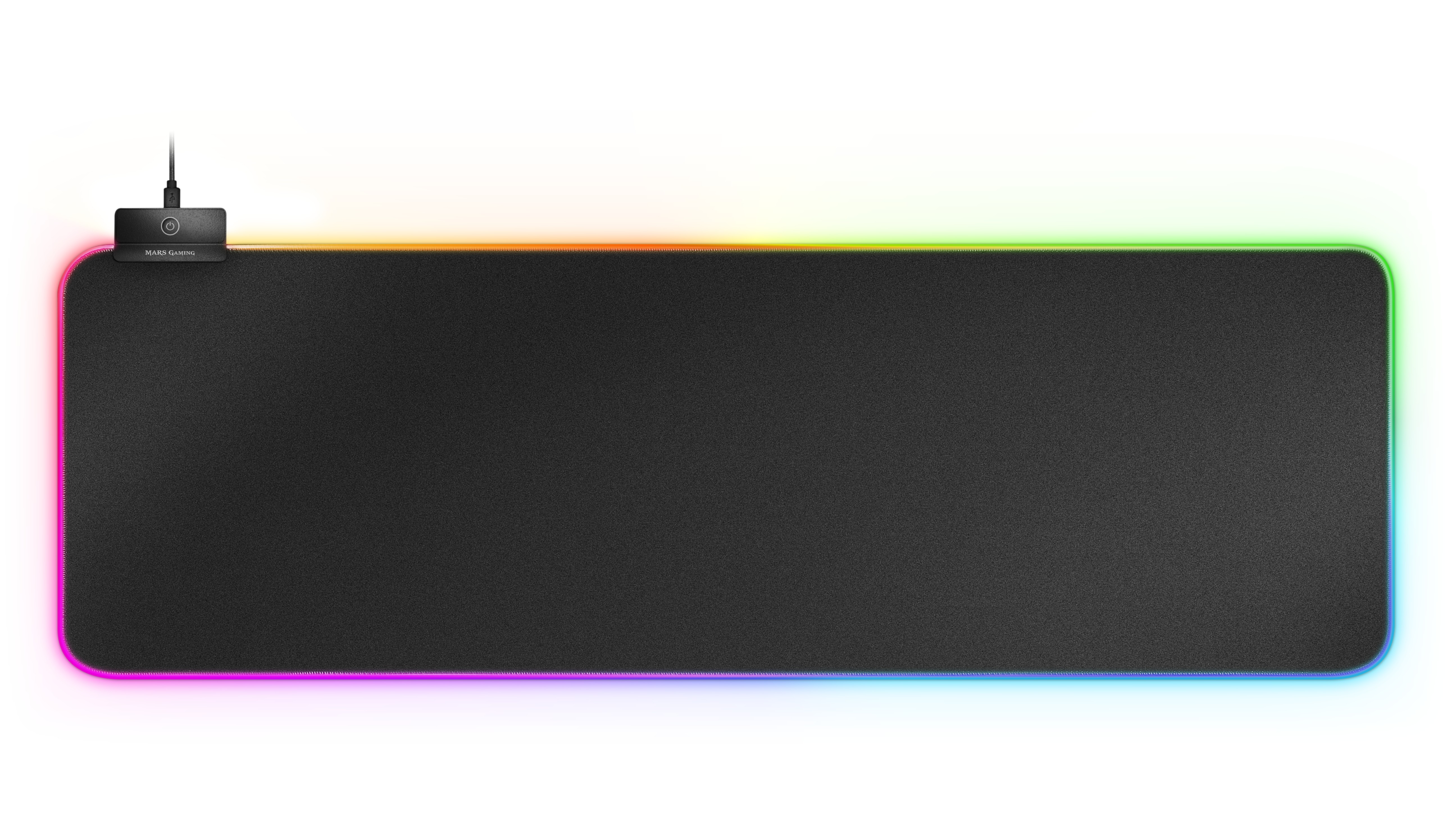 Mars Gaming MMPRGB2. Larghezza: 800 mm, Profondità: 300 mm. Colore del prodotto: Nero, Colorazione superficie: Monocromatico, Materiali: Gomma, Alimentazione USB, Colore retroilluminazione: Rosso/Verde/Blu, Barra appoggiaferro antiscivolo, Tappetino per mouse per gioco da computer