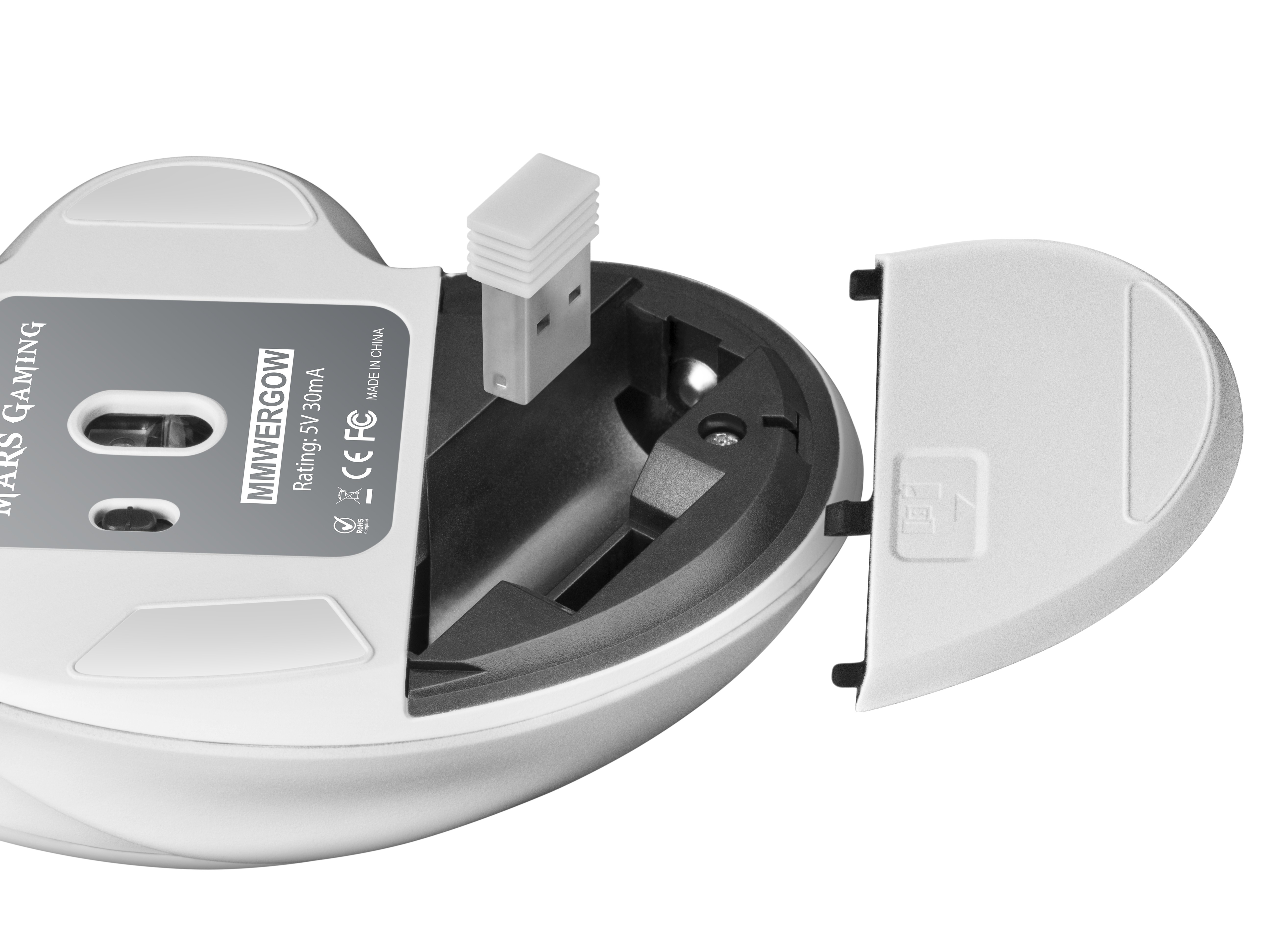 Mars Gaming MMWERGOW. Fattore di forma: Mano destra. Tecnologia di rilevamento del movimento: Meccanico, Interfaccia dispositivo: RF Wireless, Risoluzione movimento: 3200 DPI, Tipo di pulsanti: Tasti premuti, Numero di tasti: 6, Tipo di scorimmento: Rotella. Alimentazione: Batterie. Colore del prodotto: Bianco