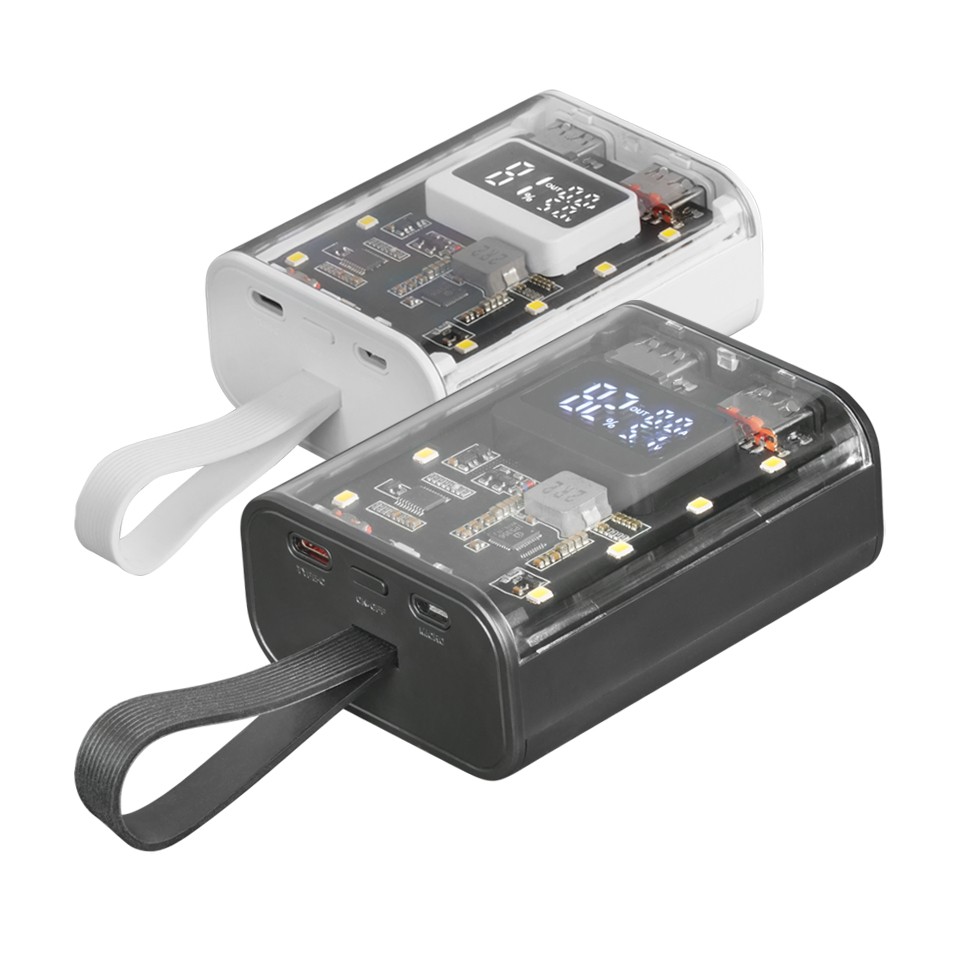 Scopri il perfetto equilibrio tra raffinatezza, tecnologia e praticità con il power bank MPK-10K. Il suo design esclusivo e compatto è caratterizzato da un involucro trasparente che rivela i componenti elettronici interni, offrendo un'esperienza di ricarica eccezionale, diversa da qualsiasi altra batteria portatile.