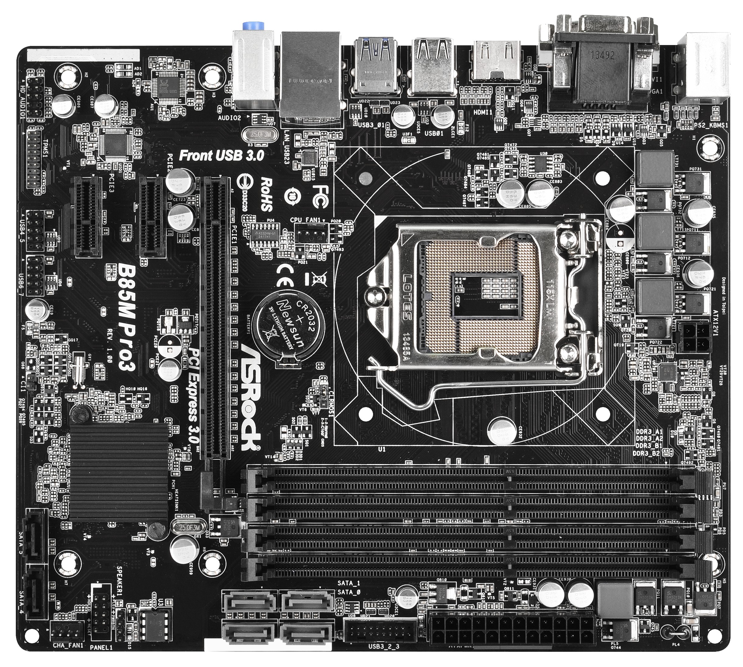 Asrock B85M Pro3. Tipi di memoria supportati: DDR3-SDRAM, tipo di slot di memoria: DIMM, Velocità di memoria supportate: 1066,1333,1600 MHz. Produttore processore: Intel, Processori compatibili: Intel® Celeron®, Intel® Pentium®, Presa per processore: LGA 1150 (Socket H3). Interfacce dell'unità di archiviazione supportate: Seriale ATA II, Serial ATA III. Controller LAN: Realtek RTL8111GR, Tipo di interfaccia Ethernet: Gigabit Ethernet. Componente per: PC, Famiglia di chipset per scheda madre: Intel, Chipset scheda madre: Intel B85