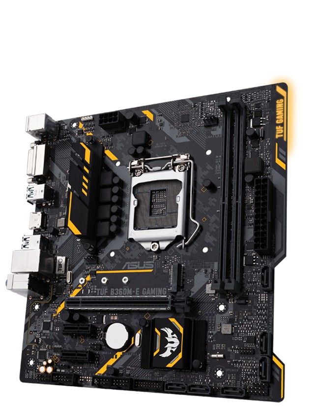 ASUS TUF B360M-E GAMING. Tipi di memoria supportati: DDR4-SDRAM, tipo di slot di memoria: DIMM, Velocità di memoria supportate: 2133,2400,2666 MHz. Produttore processore: Intel, Processori compatibili: Intel® Celeron®, Intel® Core™ i3, Intel Core i5, Intel Core i7, Intel® Pentium®, Presa per processore: LGA 1151 (Presa H4). Interfacce dell'unità di archiviazione supportate: M.2,Serial ATA III. Tipo di interfaccia Ethernet: Gigabit Ethernet, Controller LAN: Intel I219V. Componente per: PC, Famiglia di chipset per scheda madre: Intel, Chipset scheda madre: Intel® B360