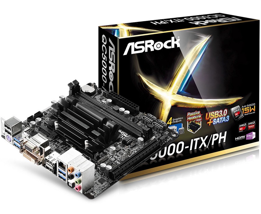 Questo prodotto supporta HDMI? (High-Definition Multimedia Interface), che è un?interfaccia standard per il trasferimento di dati video non compressi e l?audio multi-canale tramite un unico cavo. I segnali dei dati video e audio trasferiti attraverso l'interfaccia HDMI? sono digitali senza essere convertiti in analogico, quindi offrono immagini più ricche ed i suoni più realistici. Asrock QC5000-ITX/PH. Tipi di memoria supportati: DDR3-SDRAM, tipo di slot di memoria: DIMM, Velocità di memoria supportate: 1066, 1333, 1600 MHz. Famiglia processore: AMD, Socket processore: NA (CPU integrato). Interfacce HDD supportate: Serial ATA III. Controller LAN: Realtek RTL8111E, Tipo di interfaccia Ethernet: Gigabit. Componente per: PC, Fattore di forma scheda madre: Mini ITX, Sistema audio: 7.1