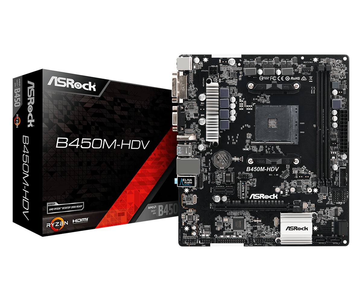 Asrock B450M-HDV. Tipi di memoria supportati: DDR4-SDRAM, tipo di slot di memoria: DIMM, Velocità di memoria supportate: 2400,2667 MHz. Produttore processore: AMD, Processori compatibili: AMD Ryzen, Presa per processore: Presa AM4. Tipo di interfaccia Ethernet: Gigabit Ethernet, Controller LAN: Realtek RTL8111H. Componente per: PC, Famiglia di chipset per scheda madre: AMD, Chipset scheda madre: AMD B450. Famiglia della scheda grafica: AMD, Risoluzione massima: 4096 x 2160 Pixel