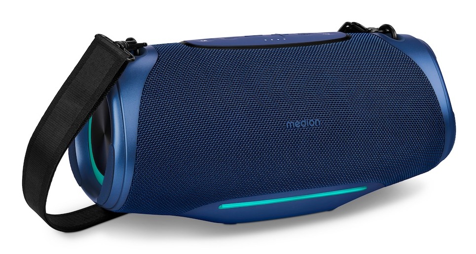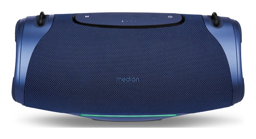 MEDION LIFE P61762. Potenza in uscita (RMS): 50 W, Impedenza: 4 Ω. Tecnologia di connessione: Wireless, Profili Bluetooth: A2DP, AVRCP, Portata Bluetooth: 10 m. Colore del prodotto: Blu, colore d'illuminazione: Multi, Codice di protezione internazionale (IP): IPX7. Utilizzo raccomandato: Universale. Tipo batteria: Batteria integrata, Tecnologia batteria: Ioni di Litio, Capacità della batteria: 5000 mAh