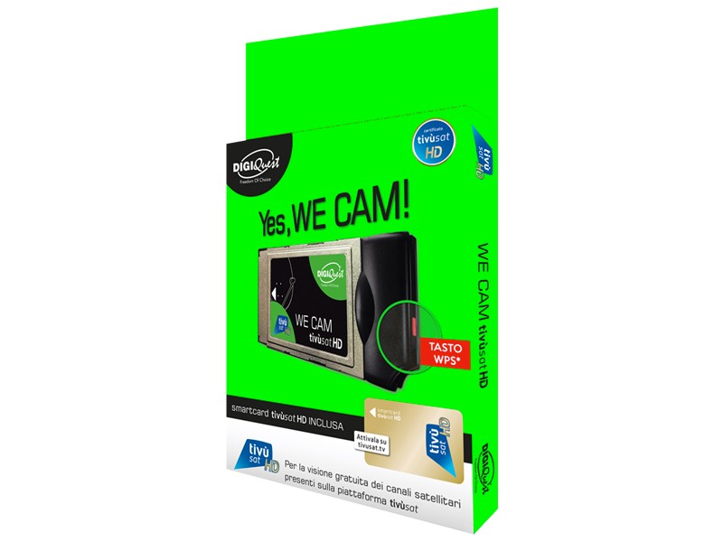 Grazie alla WE CAM Tivùsat HD potrai guardare tanti canali gratuiti nazionali ed internazionali presenti sulla piattaforma satellitare Tivùsat. Per maggiori informazioni visita il sito tivùsat.tv Come si usa La WE CAM Tivùsat HD va inserita nei TV o decoder CI+. Rilassati e goditi lo spettacolo Compatibile anche con i servizi a pagamento del digitale terrestre sistema di codifica Nagravision1: per poter fruire dei contenuti è necessaria una tessera abilitata (smart card non inclusa nella confezione ) dell'operatore prescelto. Tasto WPS per il collegamento rapido al Wi-Fi Grazie al tasto WPS presente sulla WE CAM è possibile connettere il tuo dispositivo alla Wi-Fi domestica in modo semplice e veloce. - Inserisci la WE CAM Tivùsat HD nello slot CI del tuo del tuo TV - WE CAM completerà automaticamente la prima inizializzazione - Connettila alla tua rete Wi-Fi domestica tramite WPS - Seleziona il programma sulla app EPG dello smartphone