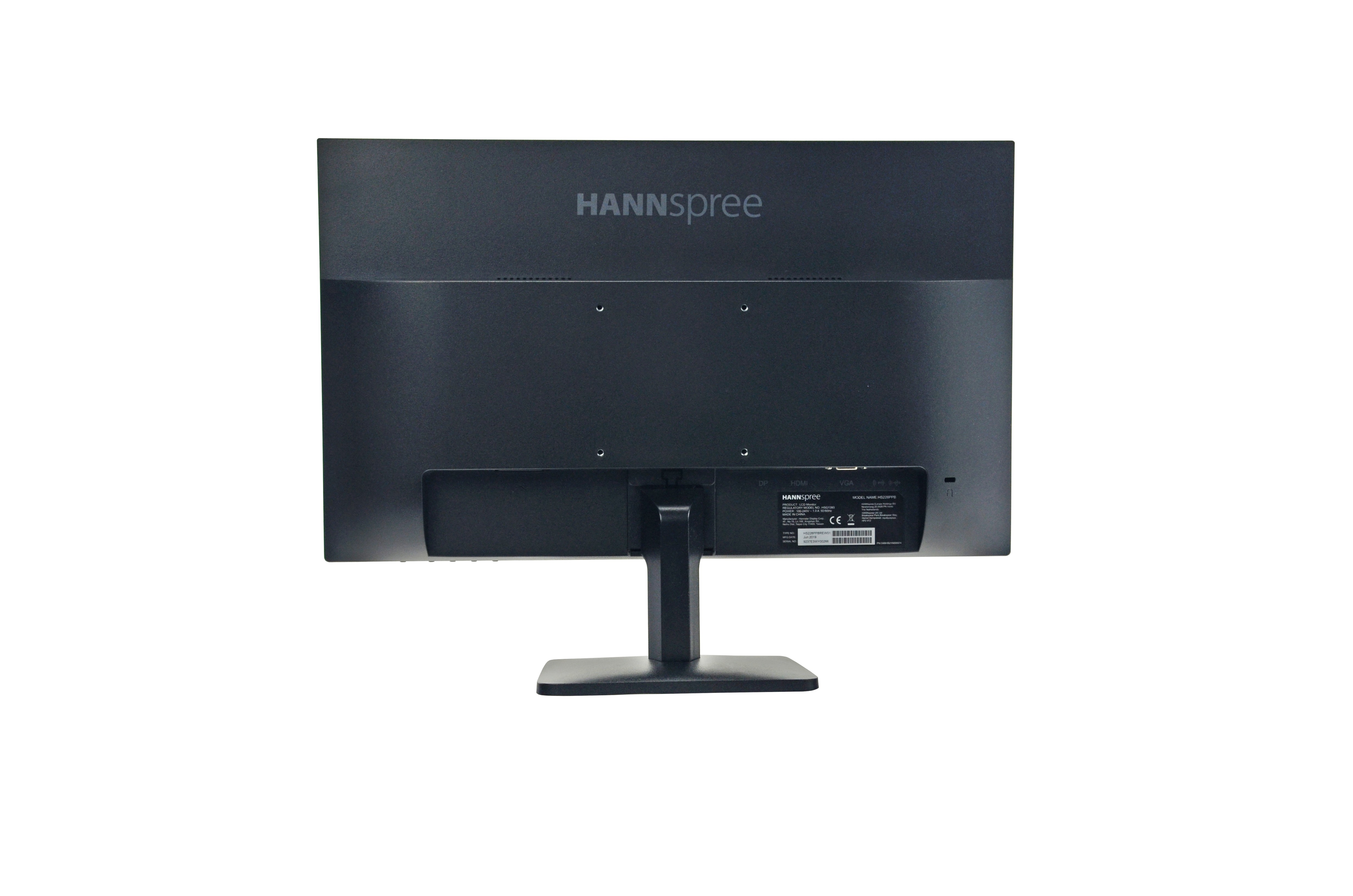 Hannspree HS228PPB. Dimensioni schermo: 54,6 cm (21.5"), Risoluzione del display: 1920 x 1080 Pixel, Tipologia HD: Full HD, Tecnologia display: LED, Tempo di risposta: 5 ms, Rapporto d'aspetto nativo: 16:9, Angolo di visualizzazione (orizzontale): 178°, Angolo di visualizzazione (verticale): 178°. Altoparlanti incorporati. Montaggio standard VESA. Colore del prodotto: Nero