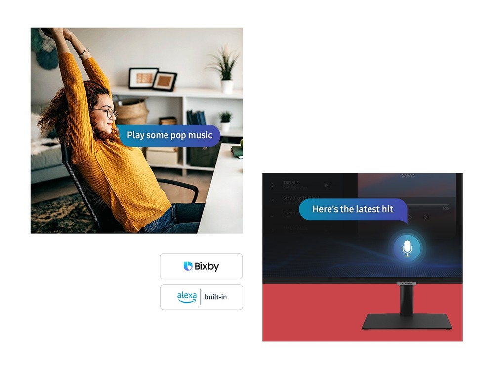 La funzione Far Field Voice ti consente di attivare il tuo assistente vocale semplicemente parlando. Impartisci il comando al monitor, anche da lunga distanza, dicendo che cosa vuoi, e sarai accontentato. Lo Smart Monitor supporta sia Bixby che Amazon Alexa.