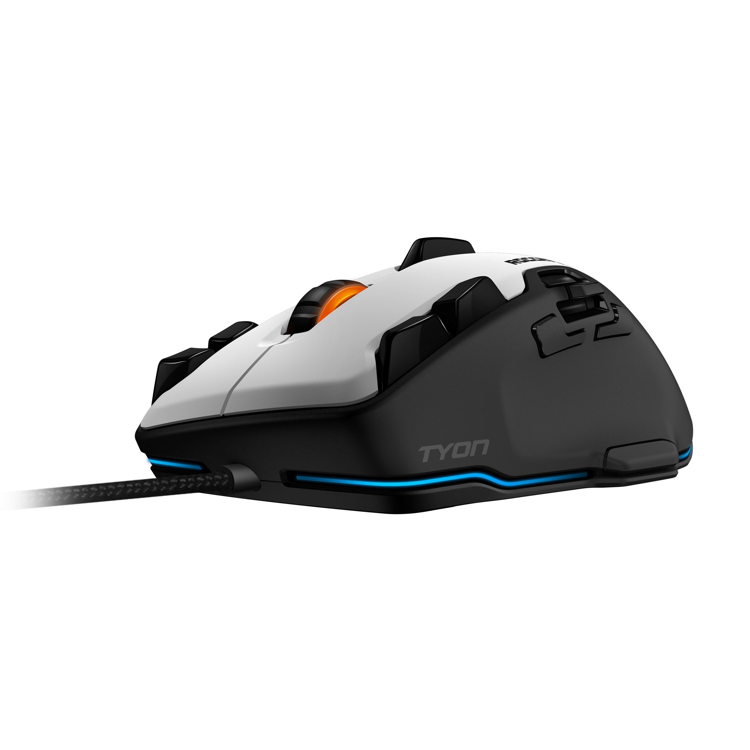 ROCCAT Tyon. Tecnologia di rilevamento del movimento: Laser, Interfaccia dispositivo: USB, Risoluzione movimento: 8200 DPI, Tempo di risposta: 1 ms, Tipo di pulsanti: Tasti premuti, Numero di tasti: 16, Tipo di scorimmento: Rotella. Peso mouse: 126 g. Colore del prodotto: Nero, Bianco