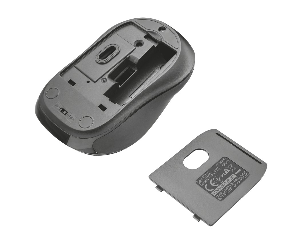 Trust 21192. Fattore di forma: Ambidestro. Tecnologia di rilevamento del movimento: Ottico, Interfaccia dispositivo: Bluetooth, Risoluzione movimento: 1600 DPI, Tipo di pulsanti: Tasti premuti, Numero di tasti: 3, Tipo di scorimmento: Rotella. Alimentazione: Batterie. Colore del prodotto: Nero