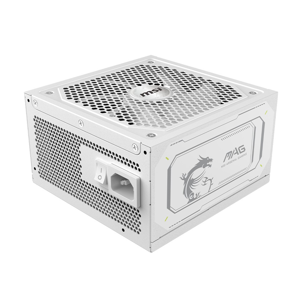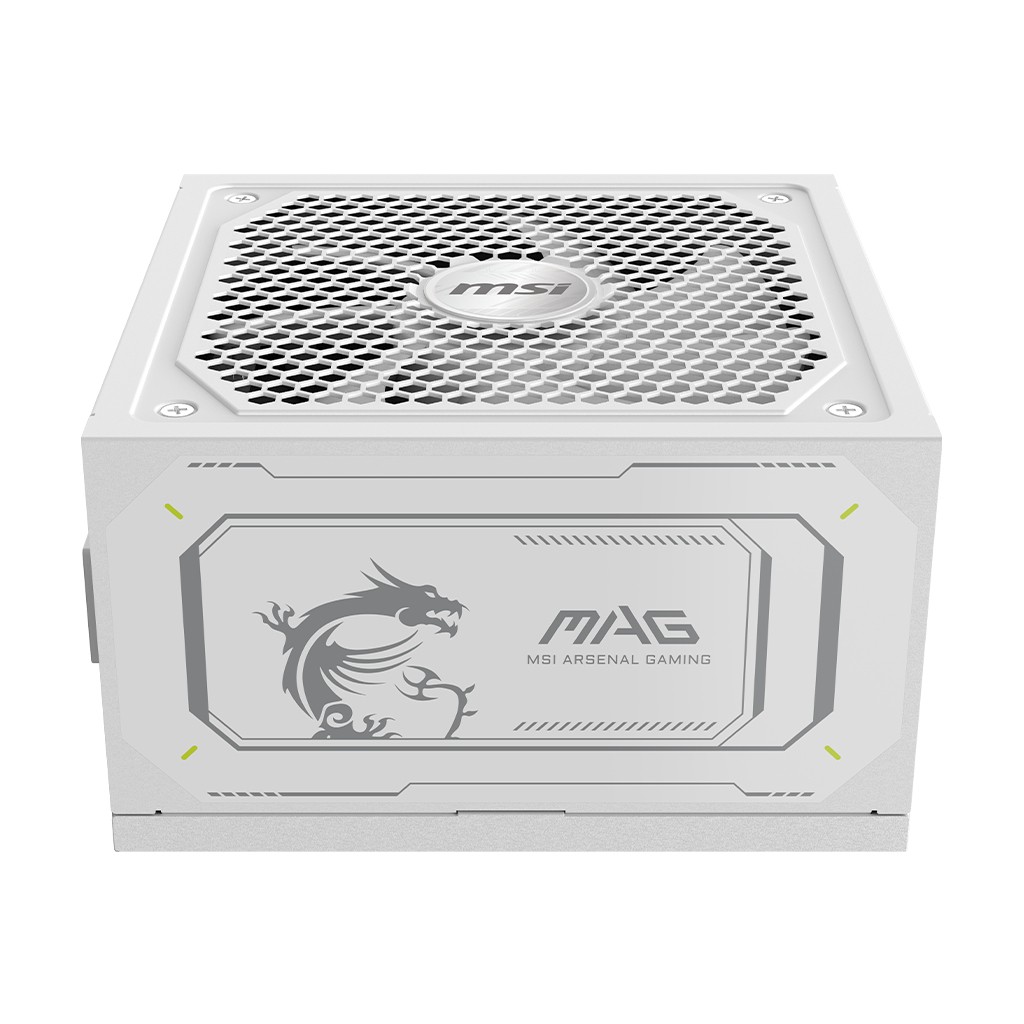 MSI MAG A1000GL PCIE5 WHITE. Potenza totale: 1000 W, Tensione di ingresso AC: 100 - 240 V, Frequenza di ingresso AC: 50/60 Hz. Connettore scheda madre: 24-pin ATX, Lunghezza del cavo di alimentazione della scheda madre: 60 cm, Lunghezza del cavo di alimentazione SATA: 150,500 mm. Utilizzo: PC, Fattore di forma dell'unità di alimentazione (PSU): ATX, Certificazione 80 PLUS: 80 PLUS Gold. Colore del prodotto: Bianco, Tipo di raffreddamento: Attivo, Diametro del ventilatore: 13,5 cm. Larghezza: 150 mm, Profondità: 150 mm, Altezza: 86 mm