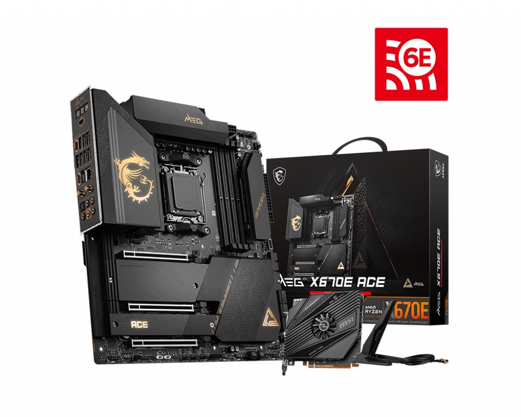 MSI MEG X670E ACE. Produttore processore: AMD, Presa per processore: Presa di corrente AM5, Processori compatibili: AMD Ryzen™ 7. Tipi di memoria supportati: DDR5-SDRAM, RAM massima supportata: 128 GB, tipo di slot di memoria: DIMM. Interfacce dell'unità di archiviazione supportate: M.2, SATA II, Tipi di unità di archiviazione supportate: HDD & SSD, Livelli RAID: 0, 1, 10. Tipo di interfaccia Ethernet: 10 Gigabit Ethernet, Wi-Fi standard: Wi-Fi 6E (802.11ax), Standard Wi-Fi: 802.11a, 802.11b, 802.11g, Wi-Fi 4 (802.11n), Wi-Fi 5 (802.11ac), Wi-Fi 6 (802.11ax), Wi-Fi 6E.... Componente per: PC, Fattore di forma scheda madre: ATX esteso, Famiglia di chipset per scheda madre: AMD