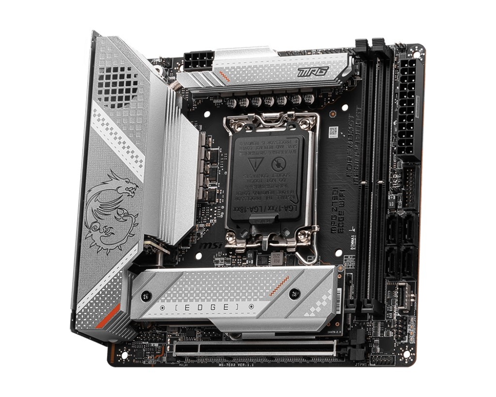 MSI MPG Z790I EDGE WIFI. Produttore processore: Intel, Presa per processore: LGA 1700, Processori compatibili: Intel® Celeron®, Intel® Pentium® Gold. Tipi di memoria supportati: DDR5-SDRAM, RAM massima supportata: 64 GB, Canali di memoria: Dual-channel. Interfacce dell'unità di archiviazione supportate: M.2, PCI Express, Tipi di unità di archiviazione supportate: HDD & SSD, Capacità memoria interna: 10 GB. Tipo di interfaccia Ethernet: 2.5 Gigabit Ethernet, Wi-Fi standard: Wi-Fi 6 (802.11ax), Standard Wi-Fi: 802.11a, 802.11b, 802.11g, Wi-Fi 4 (802.11n), Wi-Fi 5 (802.11ac), Wi-Fi 6 (802.11ax). Componente per: PC, Fattore di forma scheda madre: mini ITX, Famiglia di chipset per scheda madre: Intel