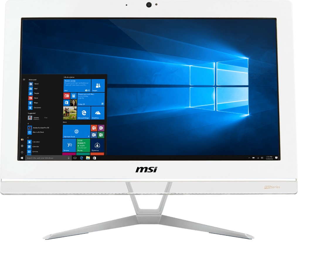 MSI Pro 20EX 7M-004EU. Tipo di prodotto: PC All-in-one. Dimensioni schermo: 49,5 cm (19.5"), Tipologia HD: HD+, Risoluzione del display: 1600 x 900 Pixel. Famiglia processore: Intel® Core™ i3 di settima generazione, Frequenza del processore: 3,9 GHz. RAM installata: 4 GB, Tipo di RAM: DDR4-SDRAM. Capacità totale di archiviazione: 1000 GB, Supporto di memoria: HDD. Modello scheda grafica integrata: Intel® HD Graphics 630. Fotocamera integrata. Tipo drive ottico: DVD Super Multi. Sistema operativo incluso: Windows 10. Colore del prodotto: Bianco
