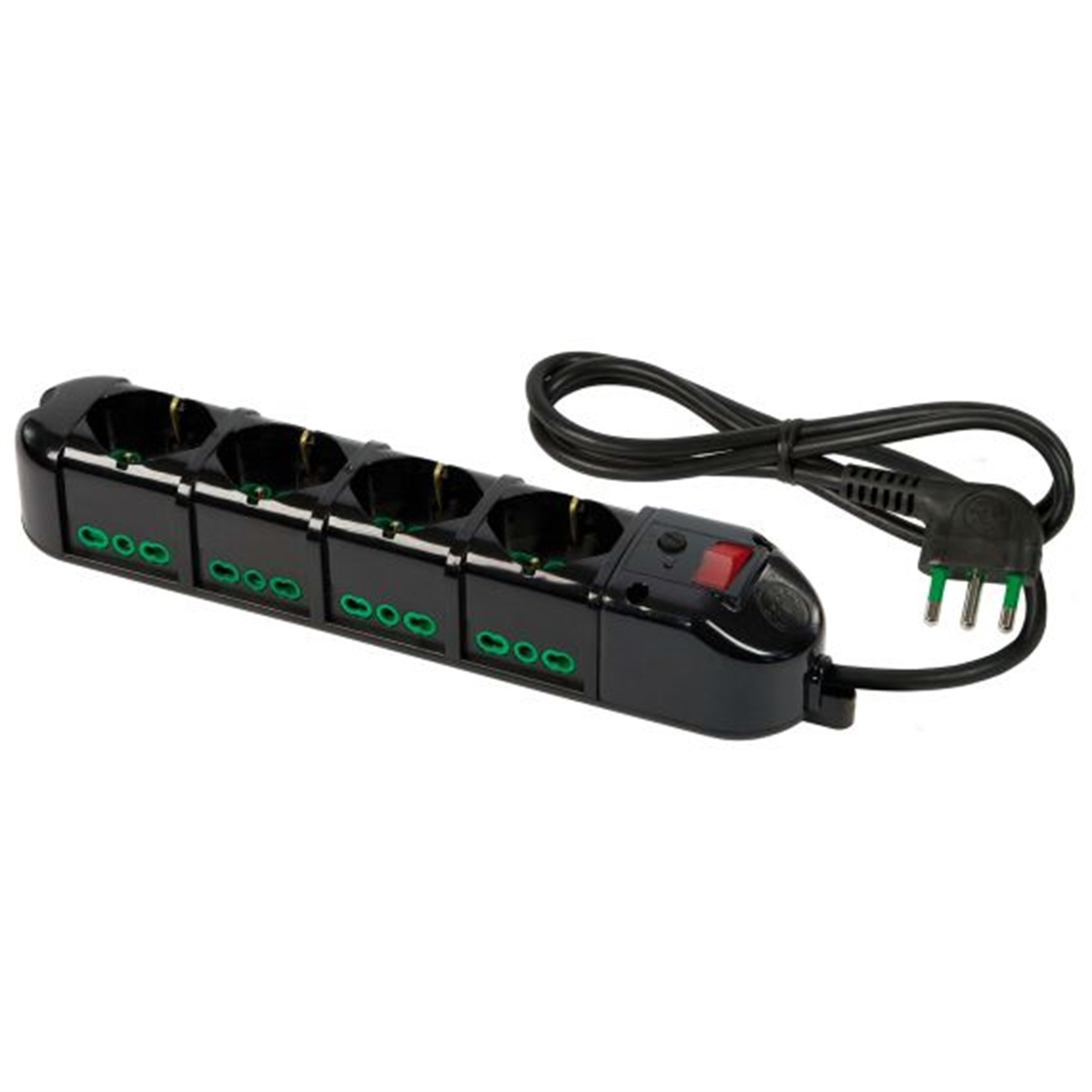 Multipresa TRIAX4 prese bipasso italo/tedesche 2P+T 16A in testa8 prese bipasso italiane 2P+T 16A lateralicavo 1,5 m.3G1 H05VV-Fspina a squadra italiana 2P+T 16A+ interruttore bipolare luminoso+ protezione sovratensioni