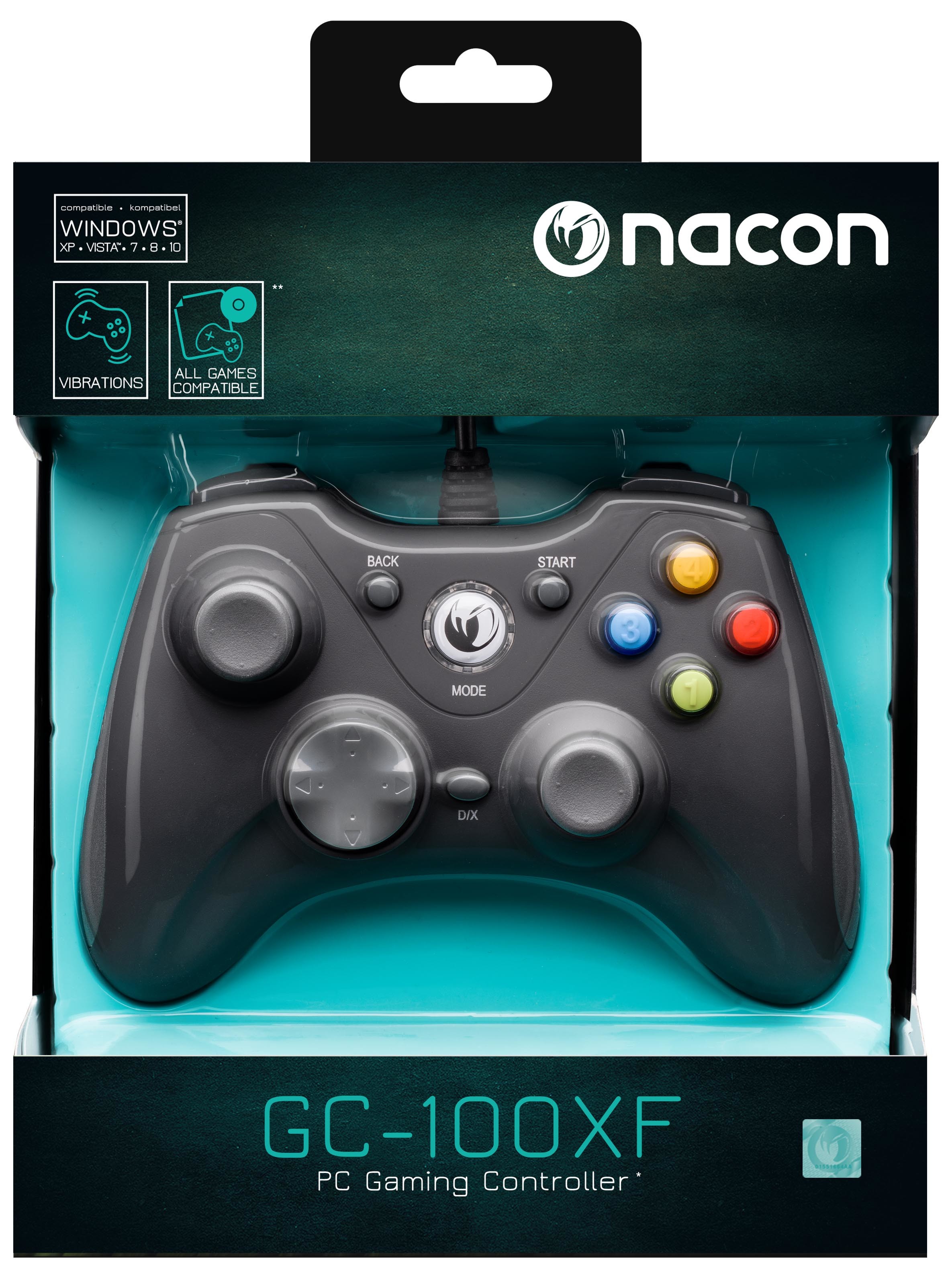 NACON PCGC-100XF. Tipo di dispositivo: Gamepad, Piattaforme di gioco supportate: PC, Tasti funzione per il controllo del gioco: Pulsante Indietro, D-pad, Tasto Home, Pulsante Modalità, Pulsante Avvio. Tecnologia di connessione: Cablato, Interfaccia dispositivo: USB. Colore del prodotto: Nero, Lunghezza cavo: 2 m. Sistema operativo Windows supportato: Windows 10 Education,Windows 10 Education x64,Windows 10 Enterprise,Windows 10 Enterprise.... Larghezza: 110 mm, Profondità: 60 mm, Altezza: 152 mm