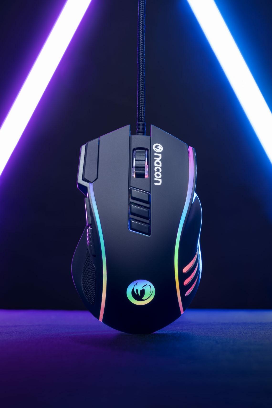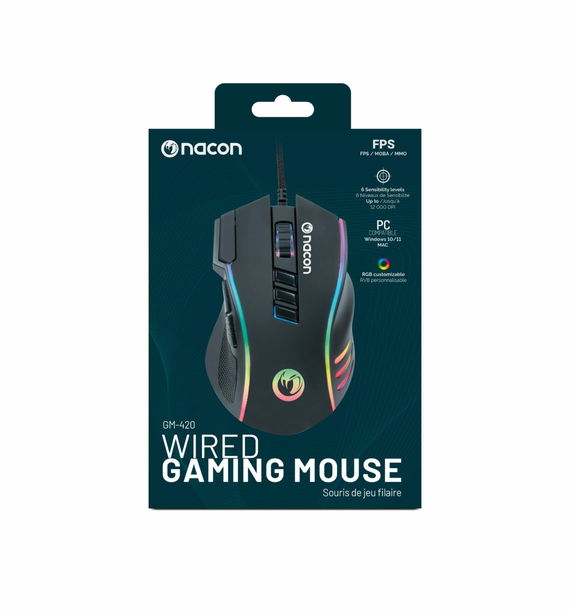 NACON GM-420. Fattore di forma: Mano destra. Tecnologia di rilevamento del movimento: Ottico, Interfaccia dispositivo: USB tipo A, Risoluzione movimento: 12000 DPI, Numero di tasti: 10, Tipo di scorimmento: Rotella. colore d'illuminazione: Multi. Alimentazione: Cavo. Colore del prodotto: Nero