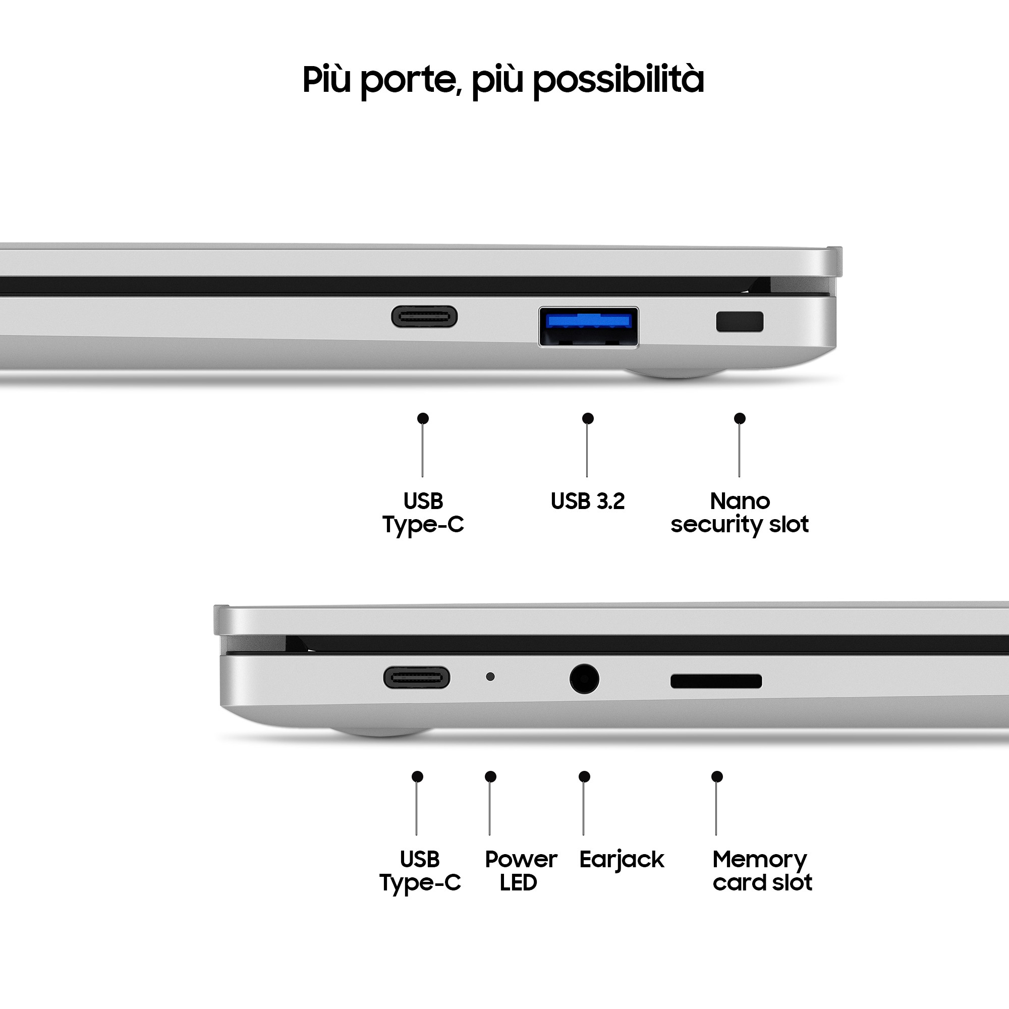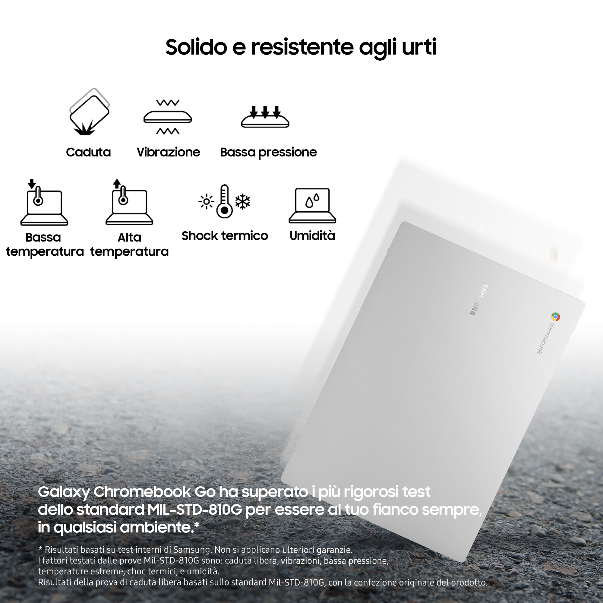 Design ultrasottile e scocca argentata, Galaxy Chromebook Go è lo strumento ideale per gli studenti sempre in movimento, che preferiscono un’esperienza di apprendimento dinamica. I computer portatili Chromebook sono dotati di Sistema operativo ChromeOS progettato da Google per una nuova generazione di computer. ChromeOS è basato su browser, alimentato dal Cloud e si avvia in pochi secondi, il che ti permette di connetterti a Internet quasi istantaneamente. E, grazie a ChromeOS, gli aggiornamenti vengono gestiti automaticamente, per rendere i PC Chromebook più veloci e più sicuri nel tempo.