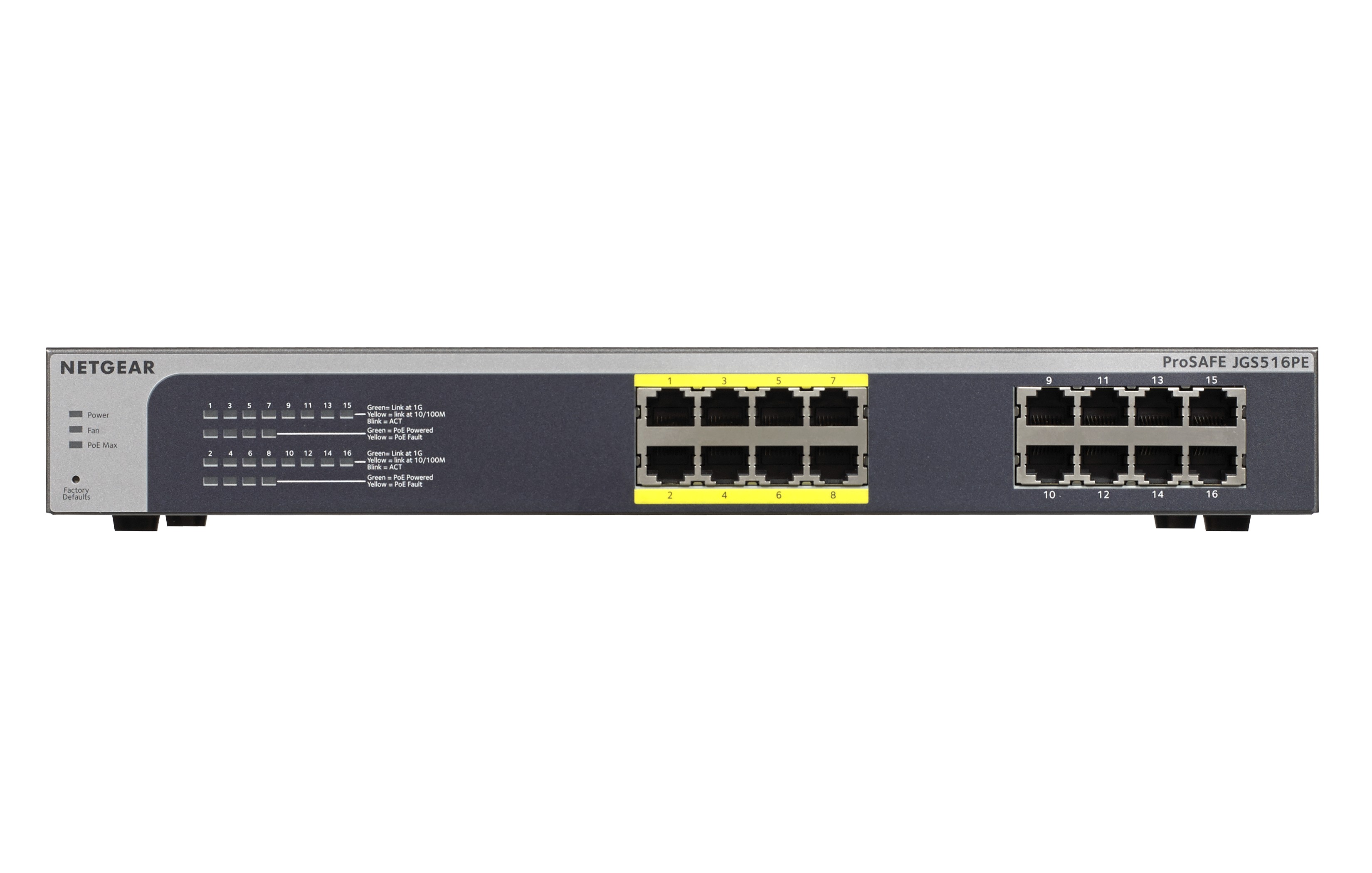 Netgear ProSafe Plus JGS516PE, Non gestito, L3, Gigabit Ethernet (10/100/1000), Full duplex, Supporto Power over Ethernet (PoE), Montaggio rack