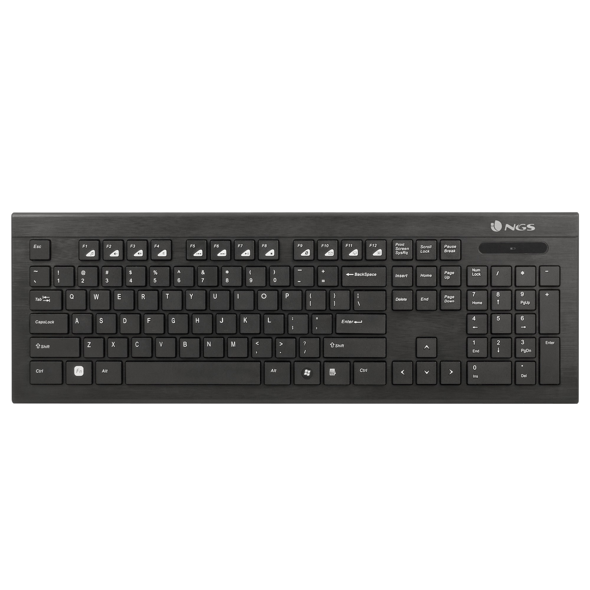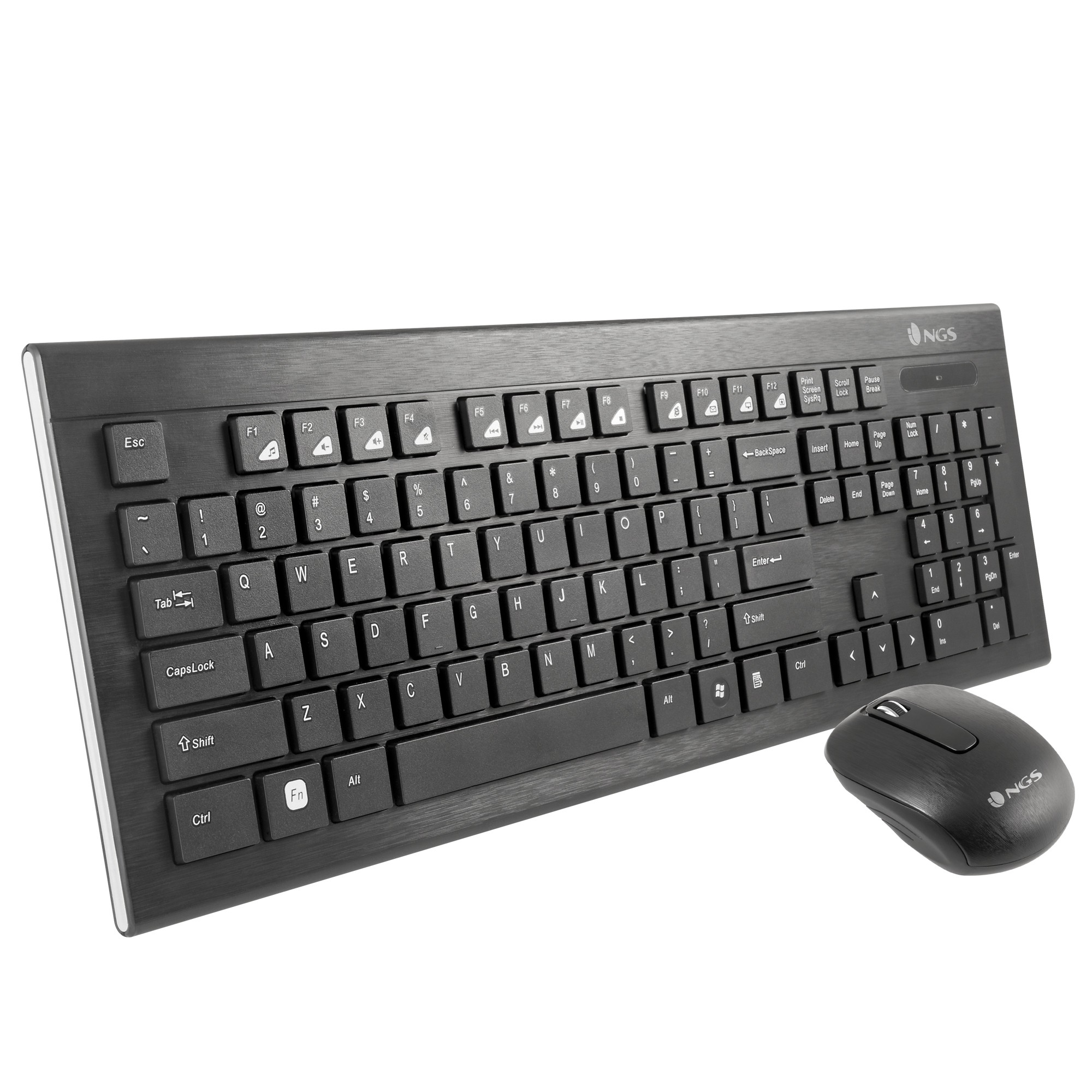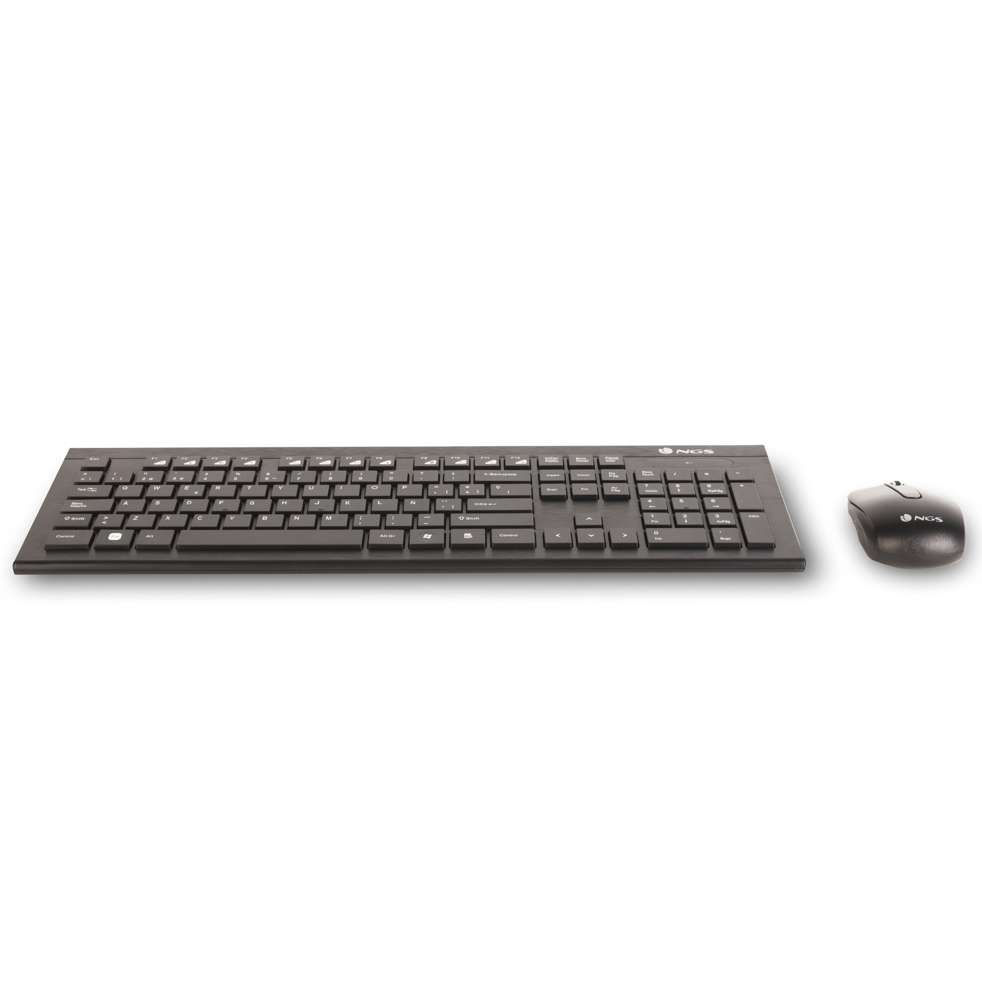 NGS Dragonfly Kit, QWERTY, ES, Full-size (100%), RF Wireless, Interruttore a chiave a membrana, QWERTY, Nero, Mouse incluso