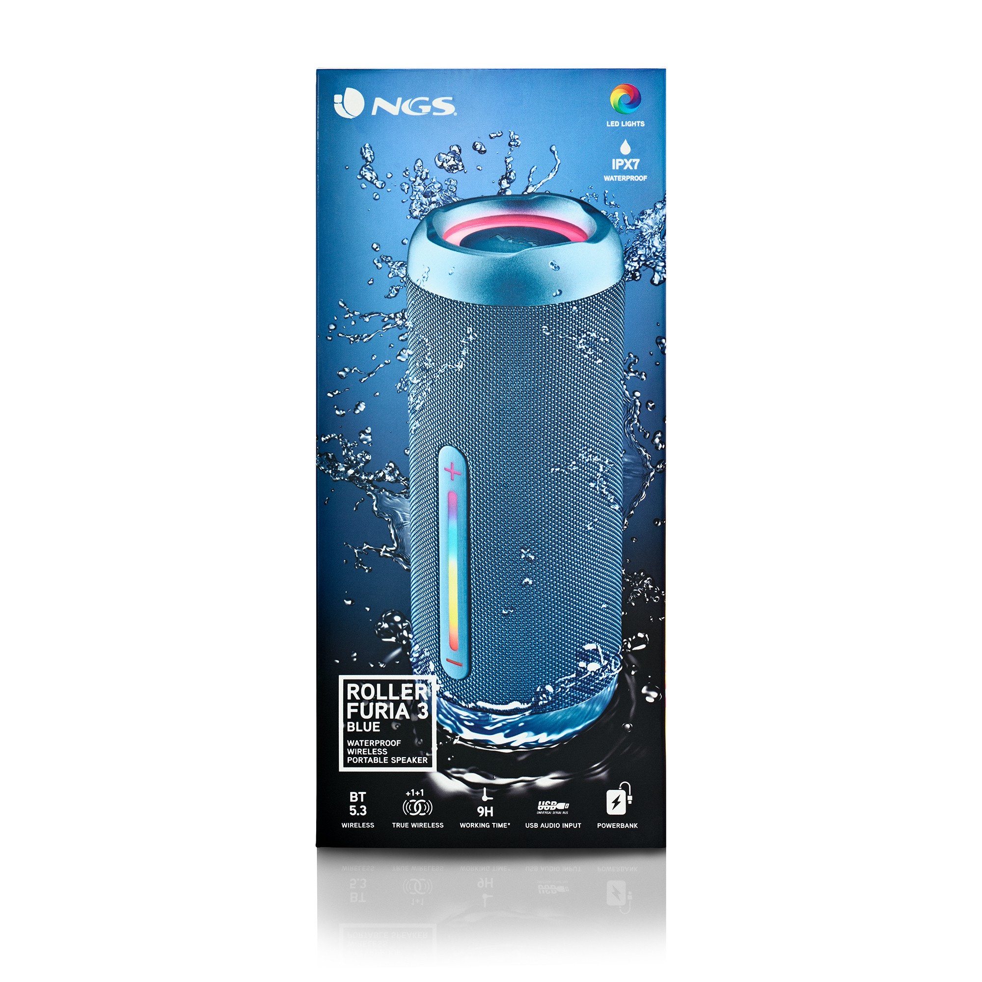 NGS ROLLER FURIA 3. Potenza in uscita (RMS): 30 W, PMPO (Potenza musicale di picco): 60 W. Tecnologia di connessione: Wireless, Range di frequenza: 2,402 - 2,48 GHz, Portata Bluetooth: 10 m. Tipo di prodotto: Altoparlante portatile stereo, Colore del prodotto: Blu, Design del prodotto: Cilindro. Utilizzo raccomandato: Universale, Formati audio supportati: MP3, WAV, WMA, Tipi schede di memoria: MicroSD (TransFlash). Tipo batteria: Batteria integrata, Tecnologia batteria: Ioni di Litio, Capacità della batteria: 5000 mAh