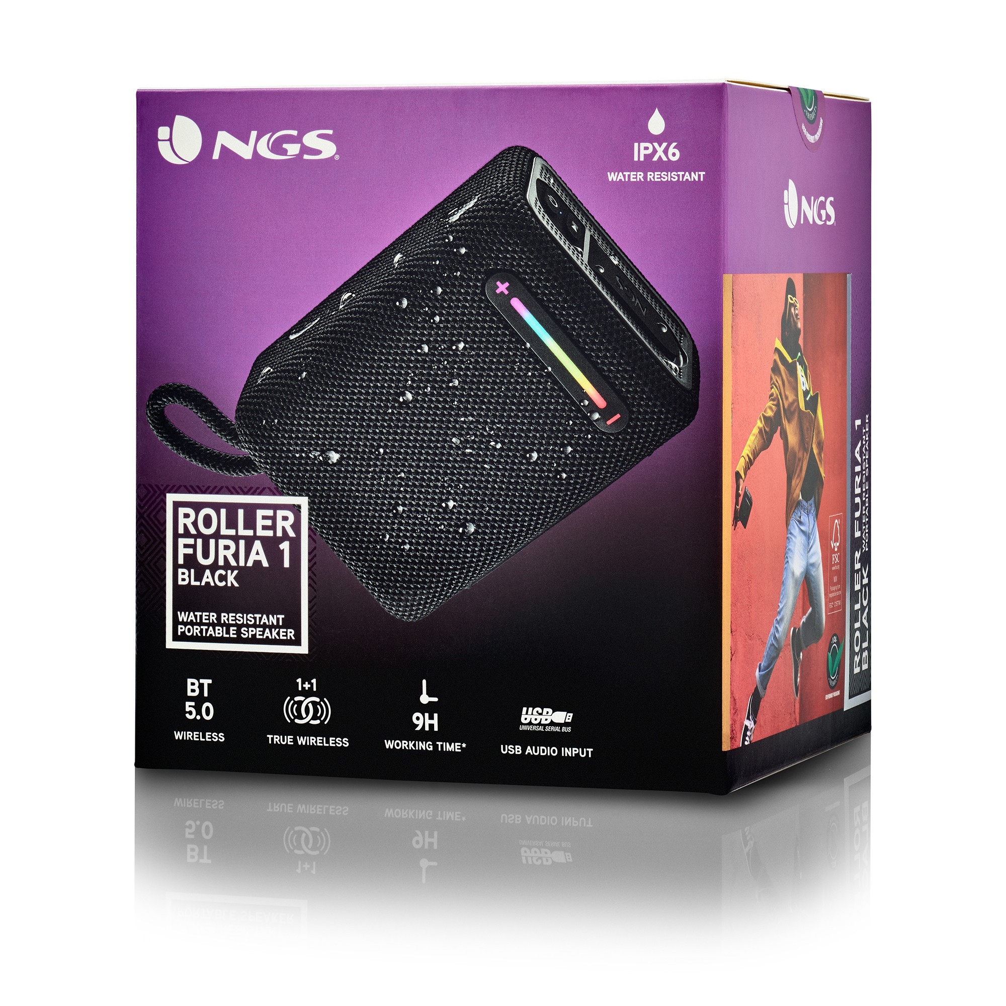 NGS ROLLER FURIA 1. Potenza in uscita (RMS): 7 W, PMPO (Potenza musicale di picco): 15 W. Tecnologia di connessione: Wireless, Range di frequenza: 2,402 - 2,48 GHz, Portata Bluetooth: 10 m. Tipo di prodotto: Altoparlante portatile stereo, Colore del prodotto: Nero, Design del prodotto: Rettangolo. Utilizzo raccomandato: Universale, Formati audio supportati: MP3, WAV, WMA. Tipo batteria: Batteria integrata, Tecnologia batteria: Ioni di Litio, Capacità della batteria: 2500 mAh