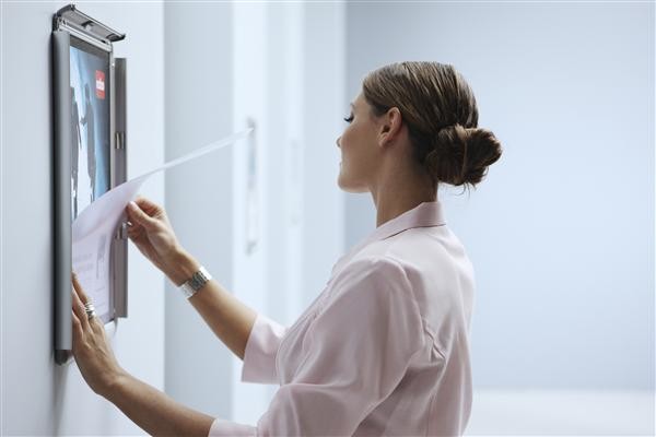 Adatte per interni ed esterni, le cornici espositive "clip down" Nobo, resistenti alle intemperie, consentono di cambiare frequentemente le informazioni con facilità. Basta sollevare i bordi della cornice di alluminio e inserire un nuovo documento o poster. Sono disponibili accessori aggiuntivi per personalizzare sia i modelli a parete che le cornici "A" indipendenti.