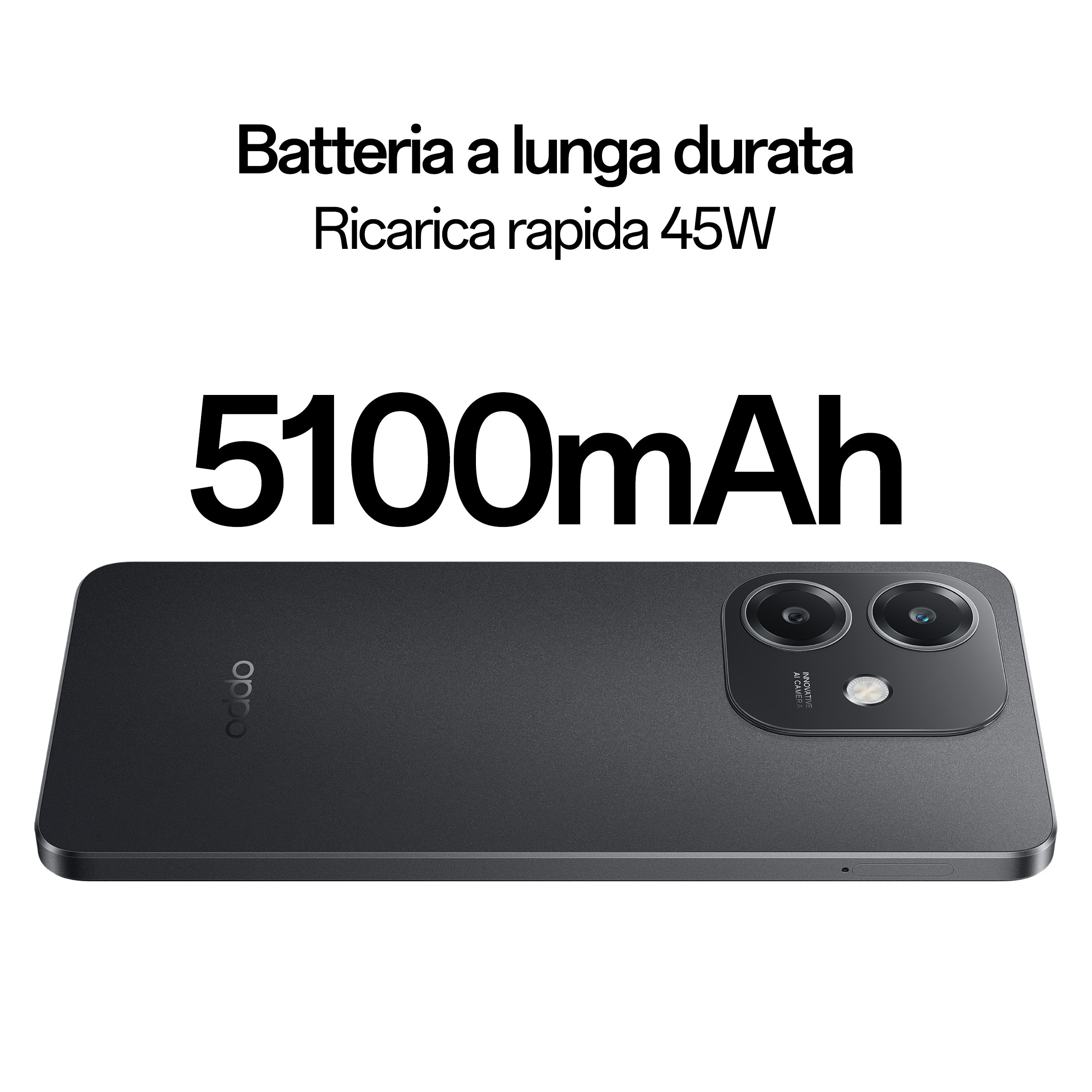 OPPO A40 Smartphone, Fotocamera AI 50MP, Selfie 5MP, Display 6.67” 90HZ LCD HD+, 5100mAh, RAM 12 GB (6+6) + ROM 128GB, IP54, [Versione Italia], Sparkle Black. Dimensioni diagonale schermo: 16,9 cm (6.67"), Risoluzione del display: 1604 x 720 Pixel. Frequenza del processore: 2,2 GHz, Famiglia processore: Qualcomm Snapdragon, Modello del processore: 6s Gen 1. Capacità della RAM: 6 GB, Tipo di RAM: LPDDR4X, Capacità memoria interna: 128 GB. Risoluzione fotocamera posteriore (numerico): 50 MP, Tipo di fotocamera posteriore: Fotocamera singola. Capacità della scheda SIM: Doppia SIM. Sistema operativo incluso: Android 14. Capacità della batteria: 5100 mAh. Colore del prodotto: Nero. Peso: 186 g